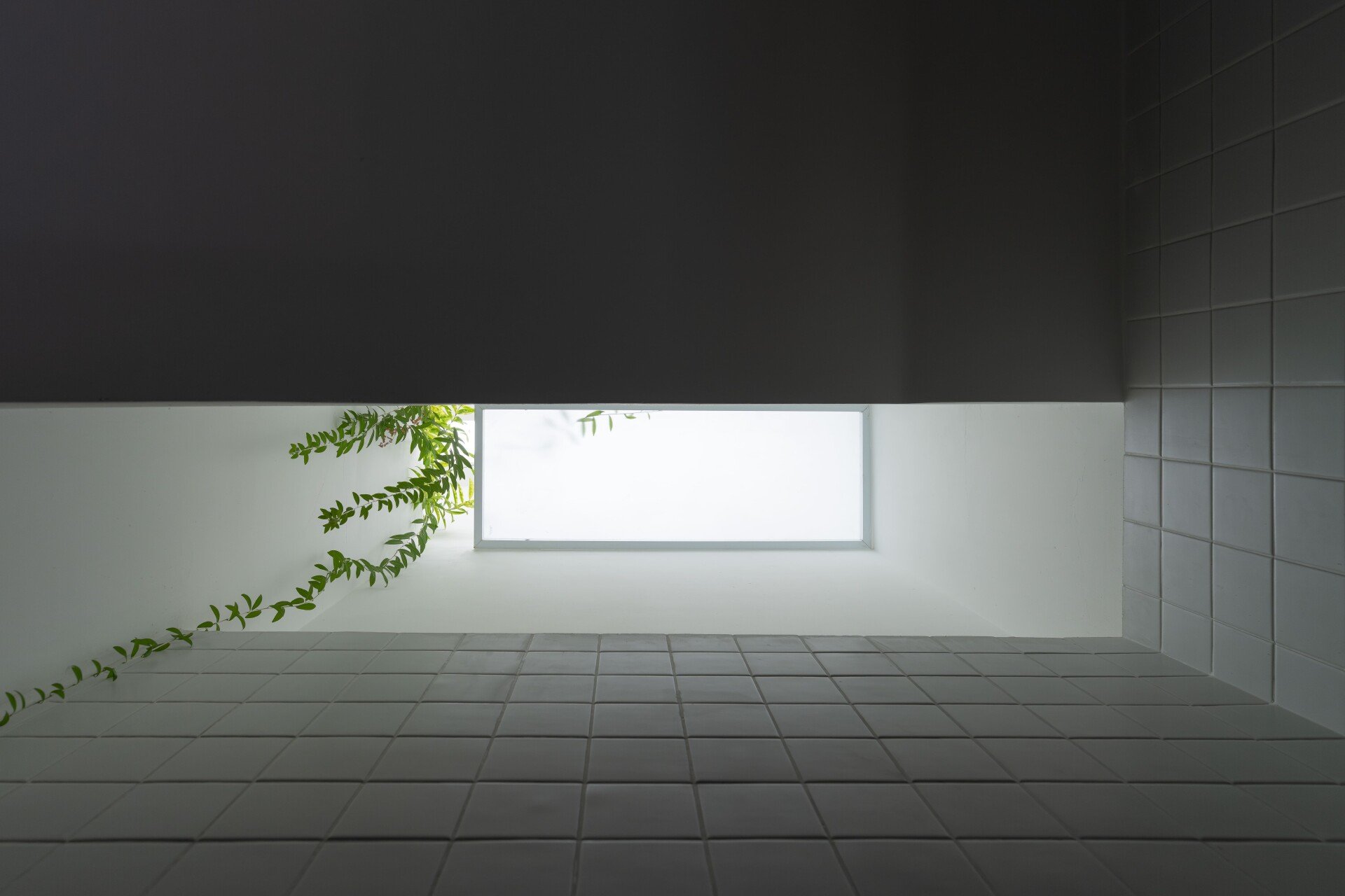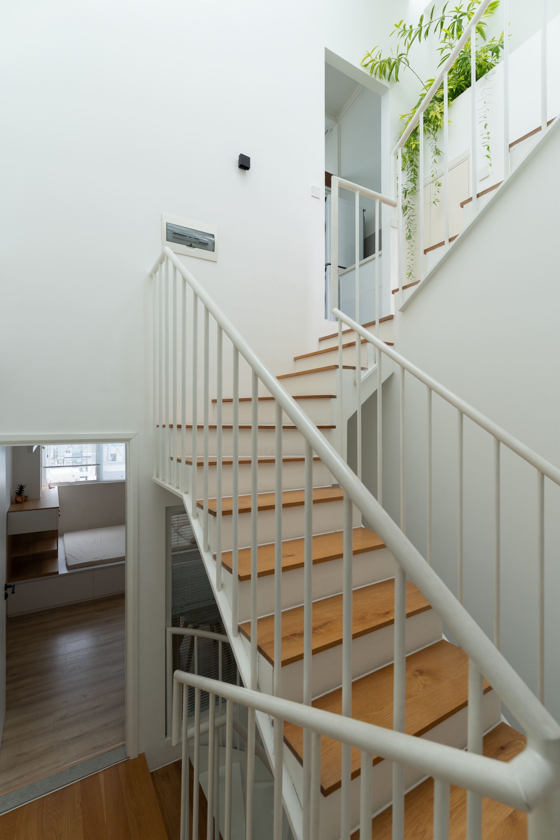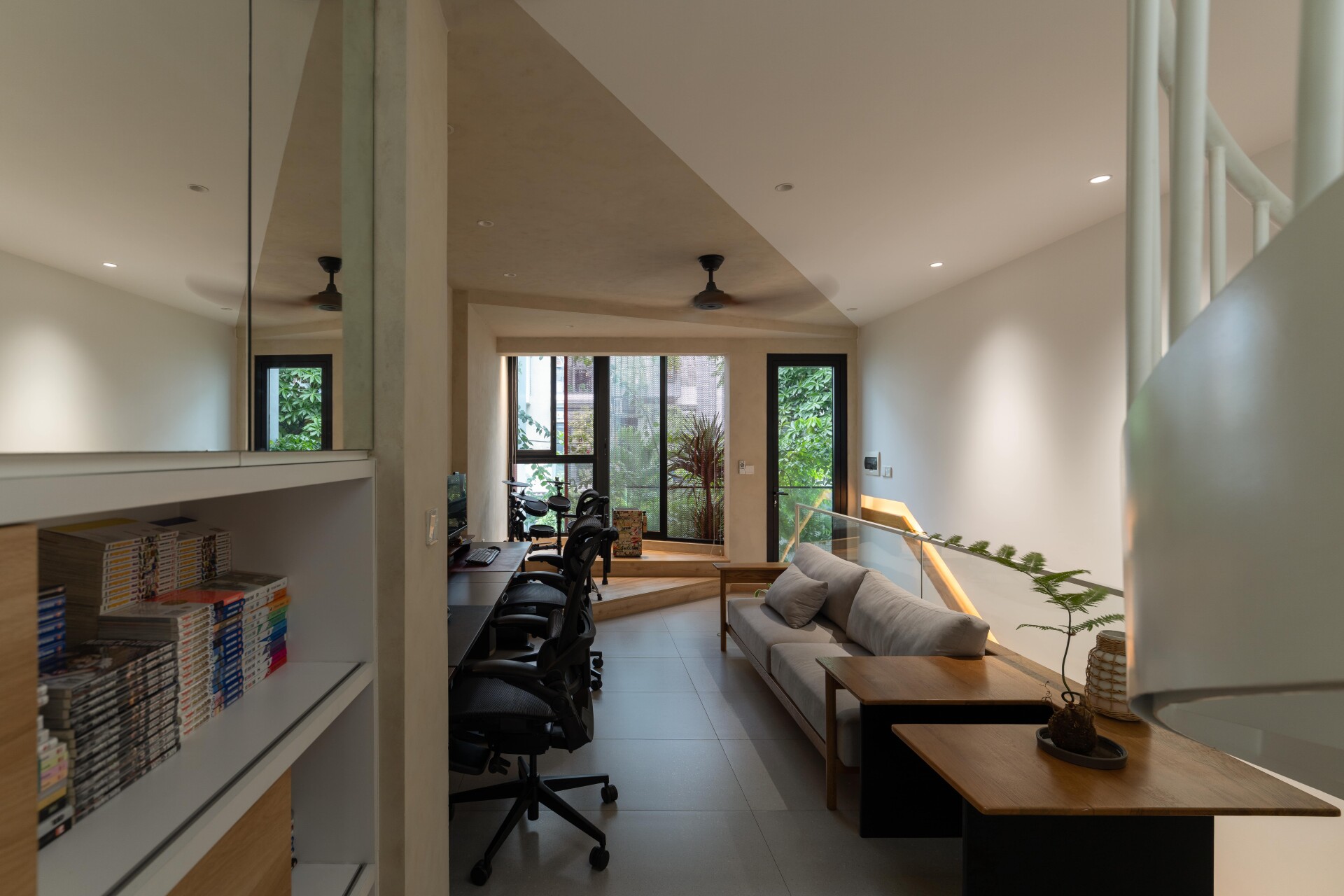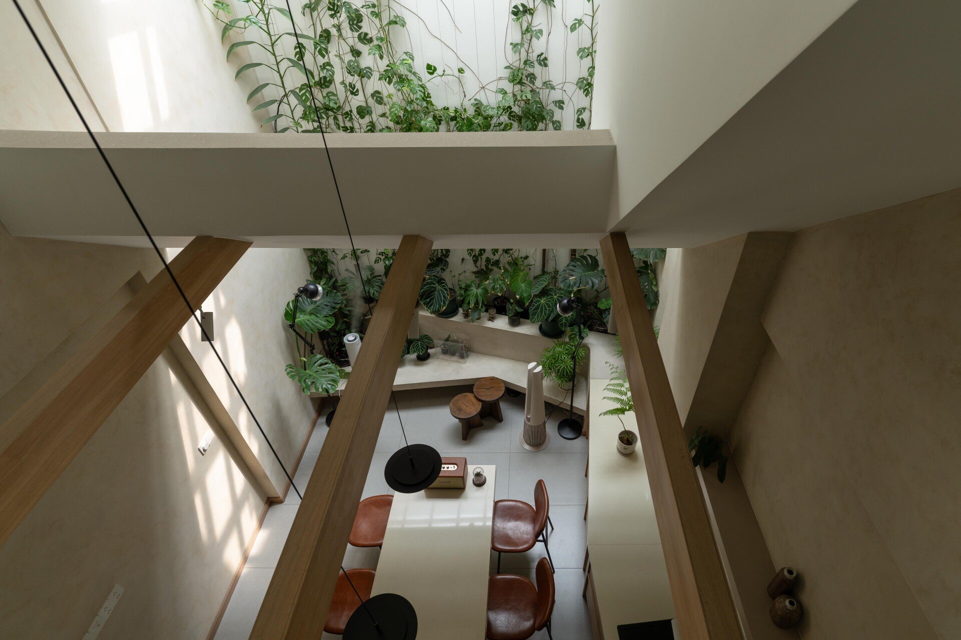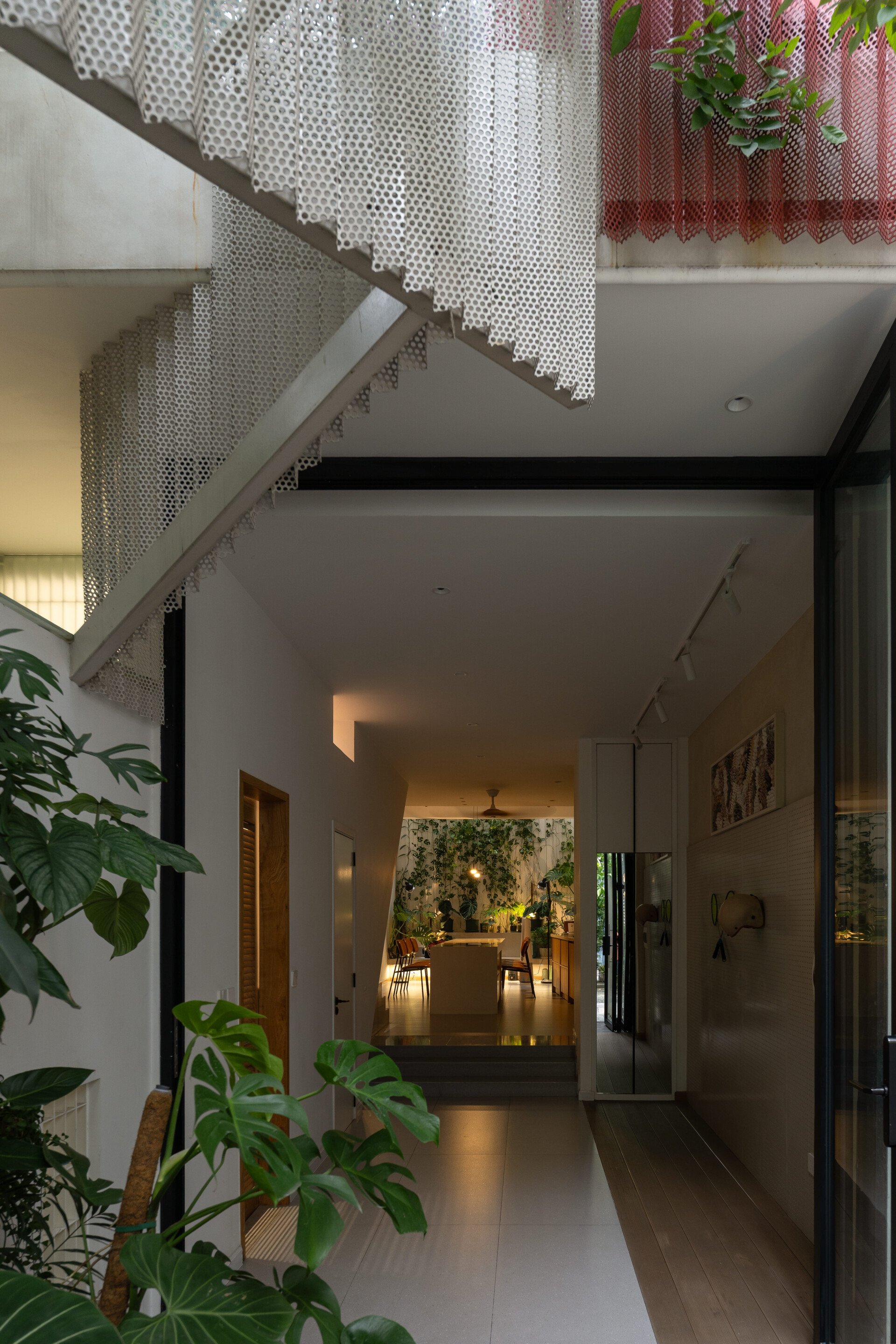 Điểm nhấn của ngôi nhà là khoảng hở cuối nhà – xử lý như một giếng trời ngang, vừa lấy sáng, vừa hút gió tự nhiên. Các mảng xanh đệm nhiệt được bố trí xen kẽ giữa các tầng giúp điều hòa độ ẩm, tạo bầu không khí dịu mát và chiều sâu cảm xúc cho không gian sống.