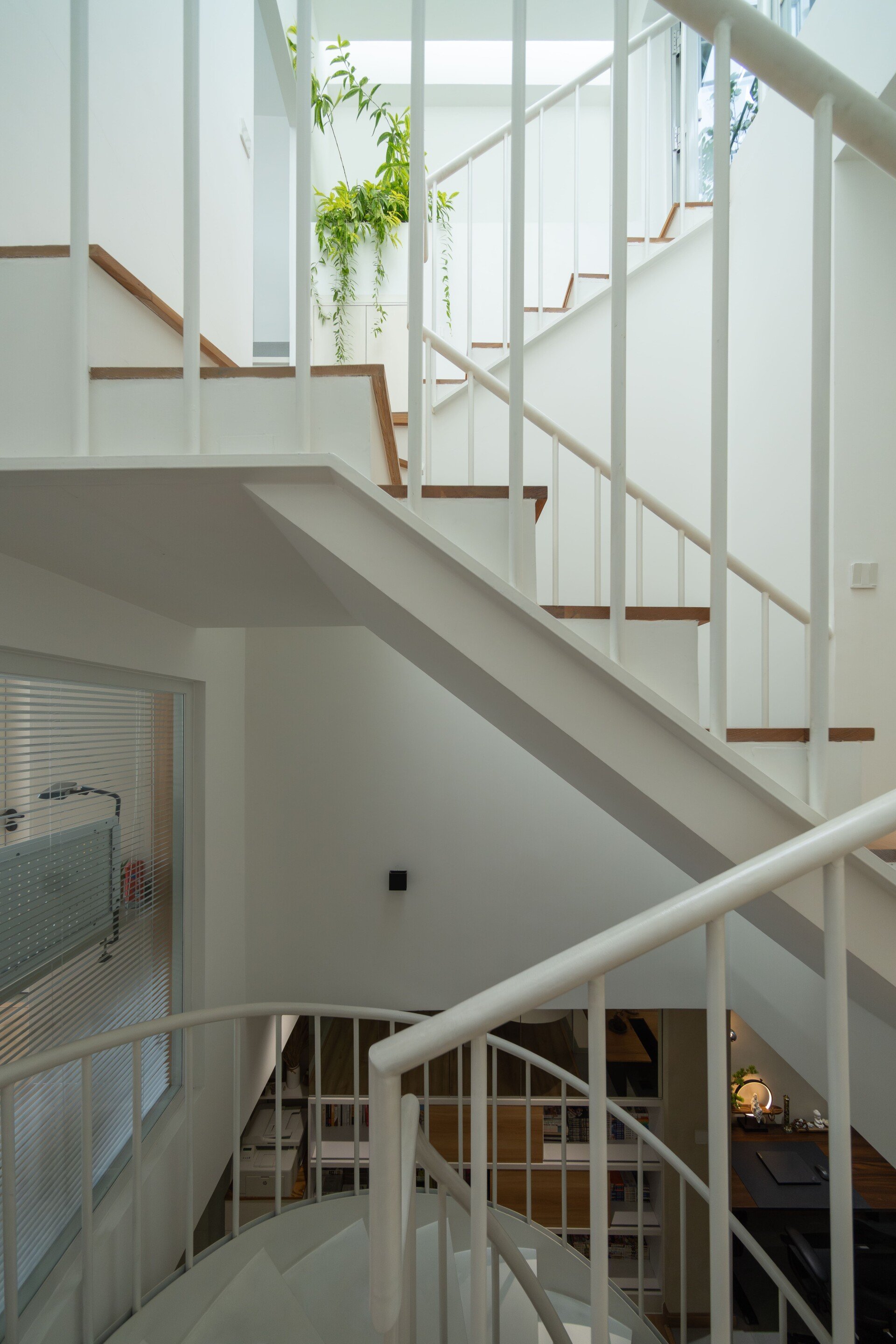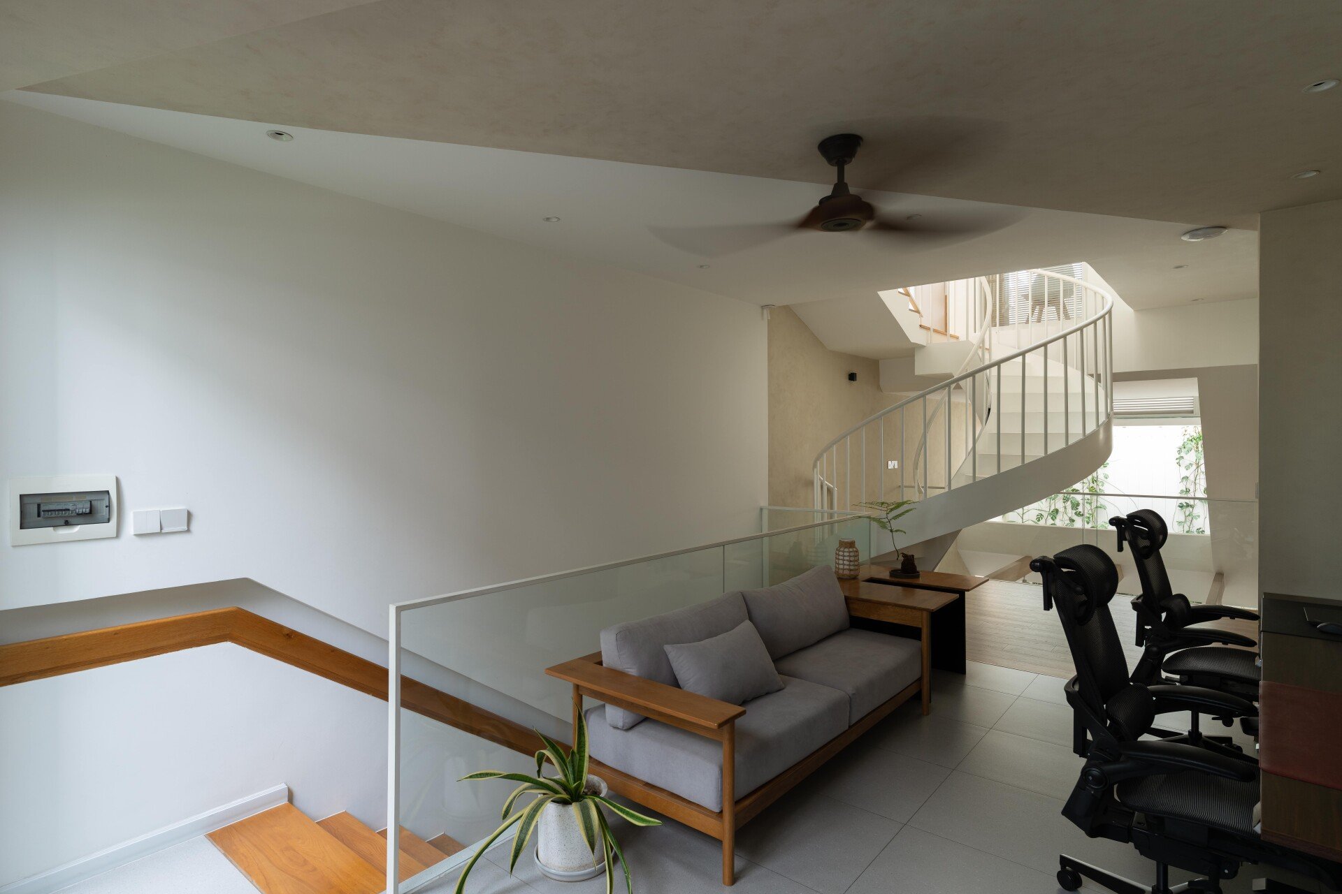 Nhịp không gian được nối bằng cầu thang cong – một chuyển động mềm mại giúp tiết kiệm diện tích, giảm phân mảnh và tăng tương tác giữa các thành viên.