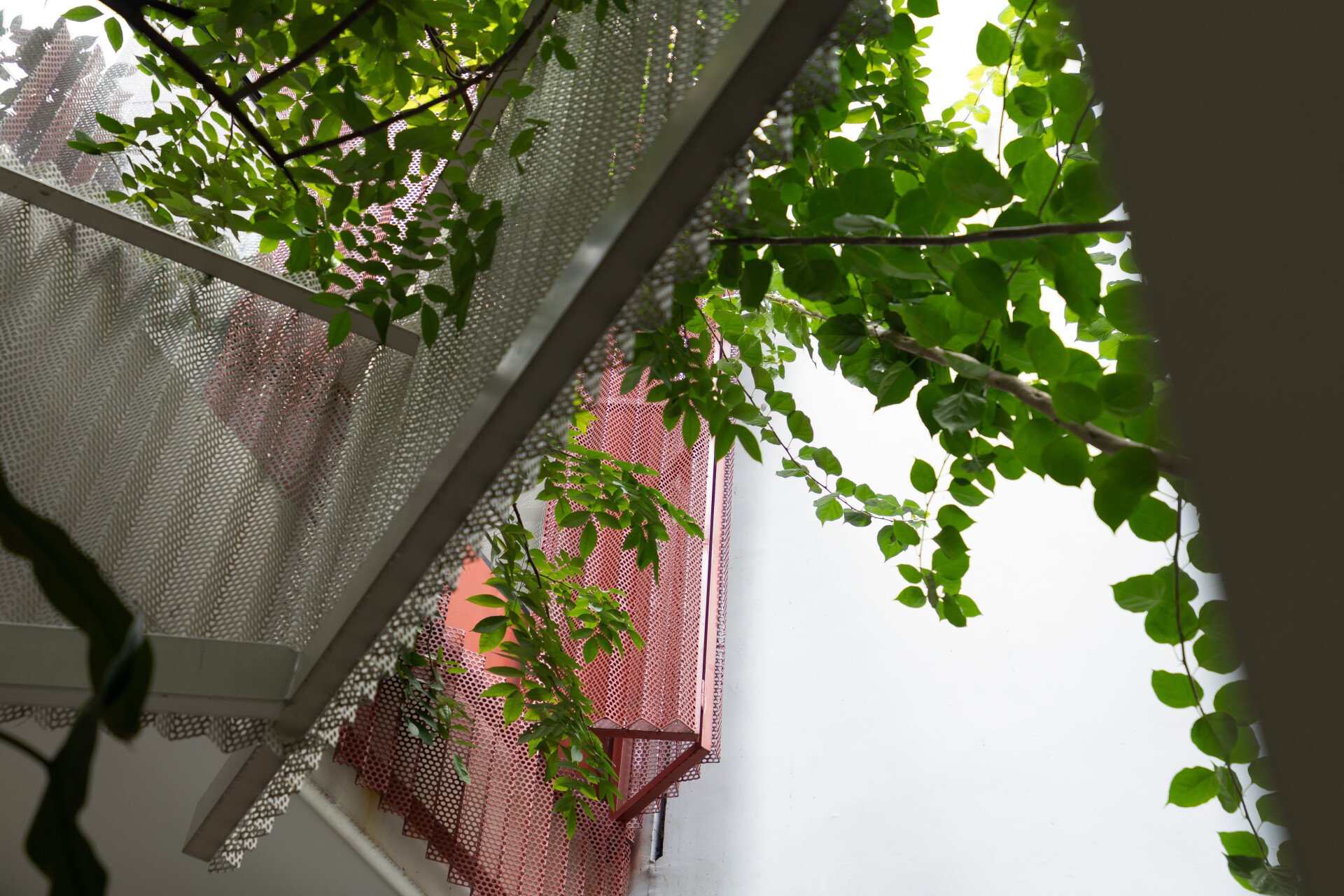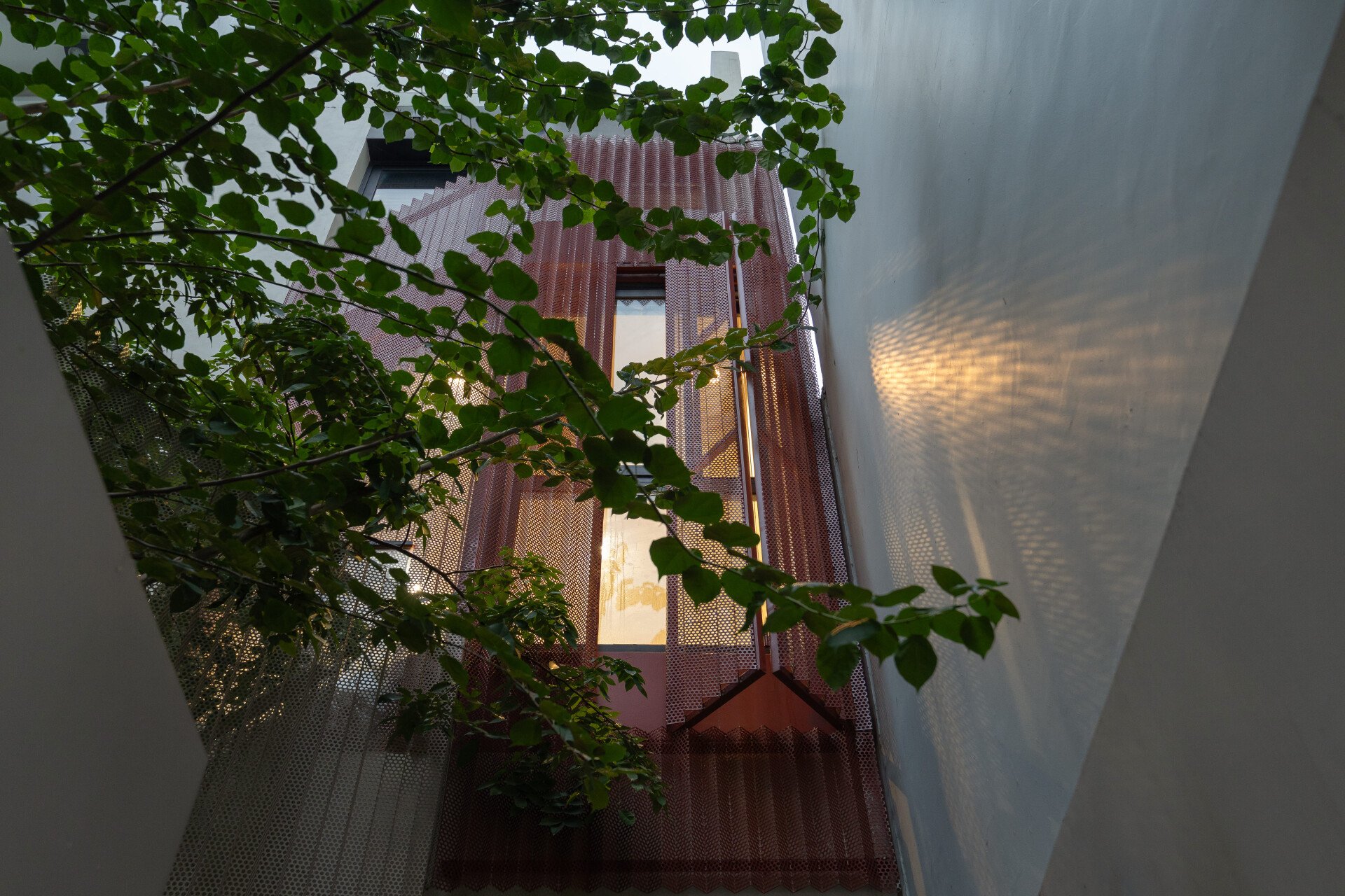 • Cấu trúc giật cấp của lớp lưới giúp cân bằng hình dáng bất đối xứng của khu đất, tạo nên một mặt đứng hài hòa và có chiều sâu.