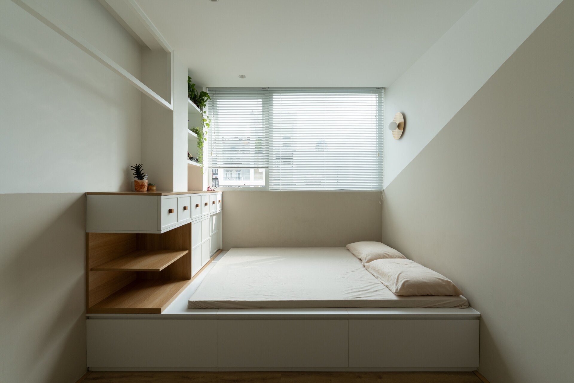 Tầng ba: Hai phòng ngủ, mỗi phòng đều có vệ sinh riêng và tiếp cận ánh sáng tự nhiên. Phòng ngủ chính tận dụng khoảng lùi của mặt đứng để dẫn ánh sáng từ mái vào sâu, kể cả khu vực phòng tắm – riêng tư nhưng thoáng sáng.