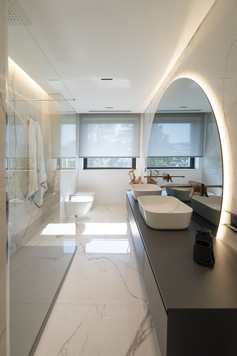 Bồn rửa đôi nổi bật trên nền tường ốp marble, gương lớn hình vòng cung phản chiếu ánh sáng mềm mại. Cách bố trí cân đối giúp phòng tắm mang vẻ đẹp hài hòa và hiện đại