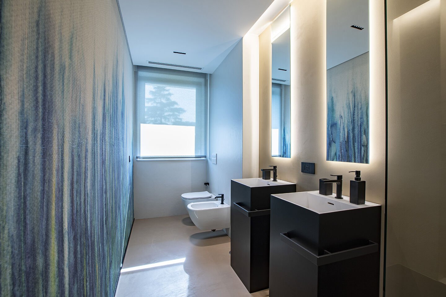 Phòng vệ sinh phụ gây ấn tượng với tông xanh lam chuyển sắc và ánh sáng hắt viền gương. Hai bồn rửa vuông sắc nét cùng chi tiết kim loại đen mờ tạo nên không khí đương đại, sang trọng