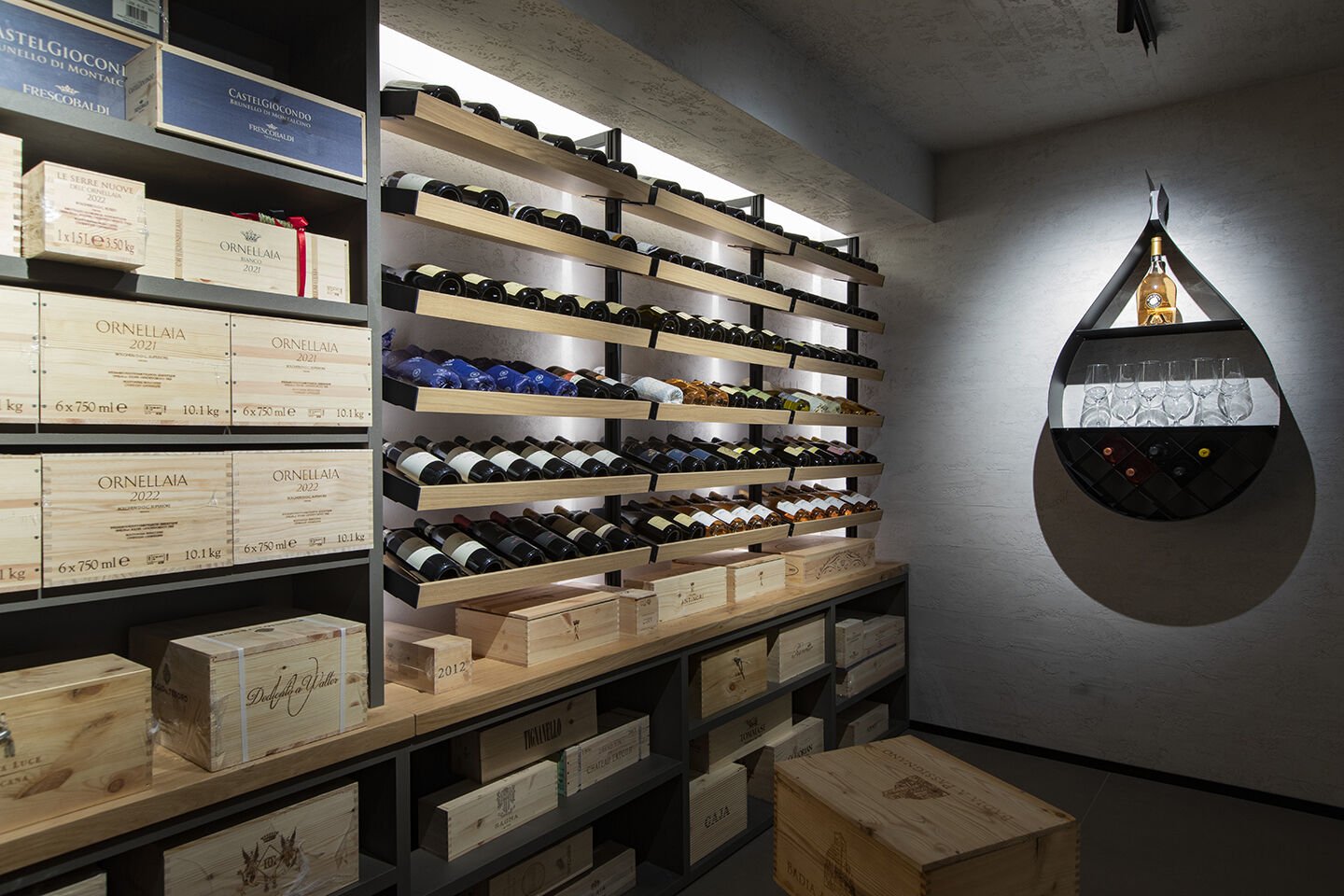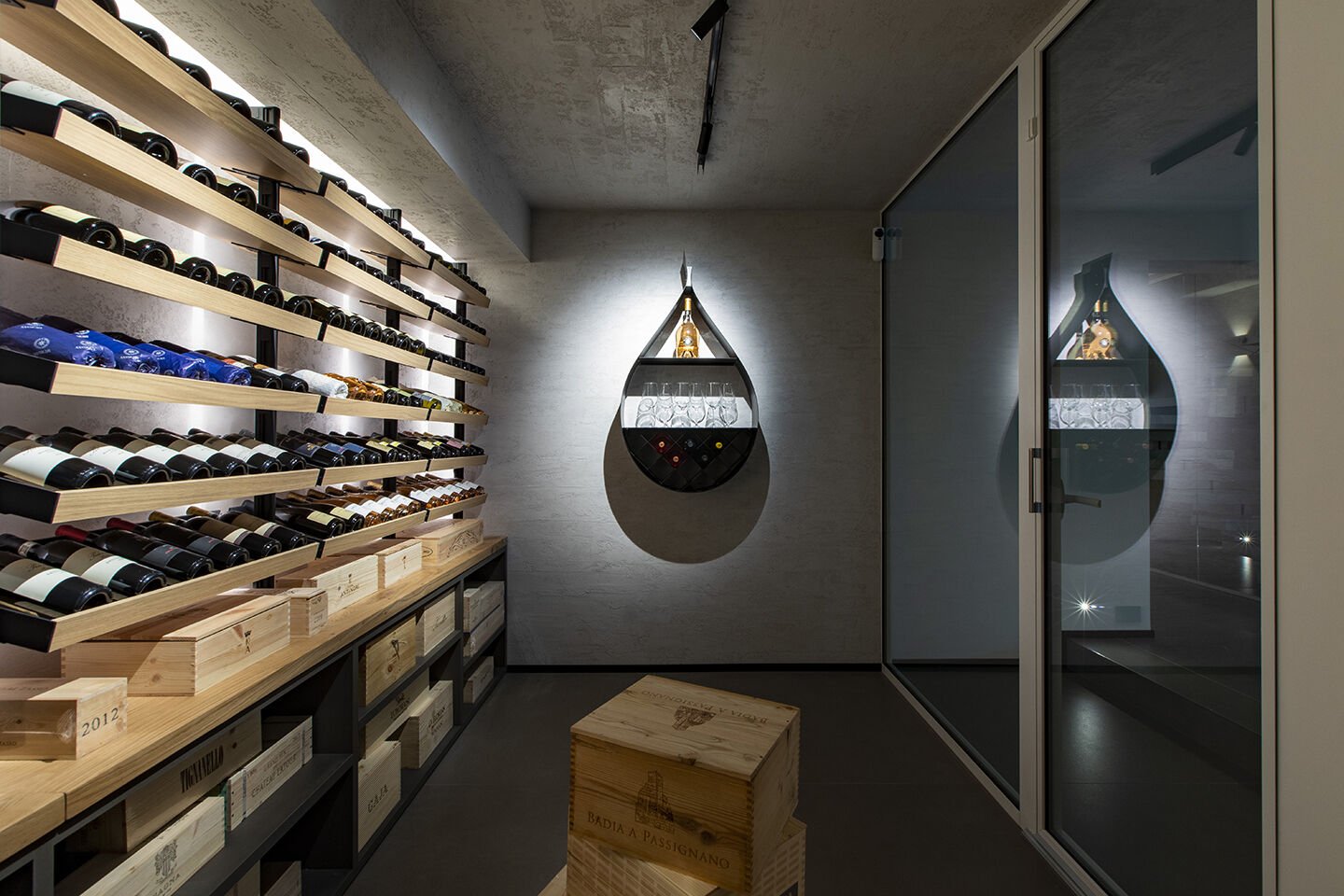 Hầm rượu được thiết kế với kệ gỗ sáng màu và ánh sáng tập trung tinh tế. Từng chai rượu được sắp xếp gọn gàng, tạo không gian lưu trữ vừa nghệ thuật vừa đậm chất sưu tầm