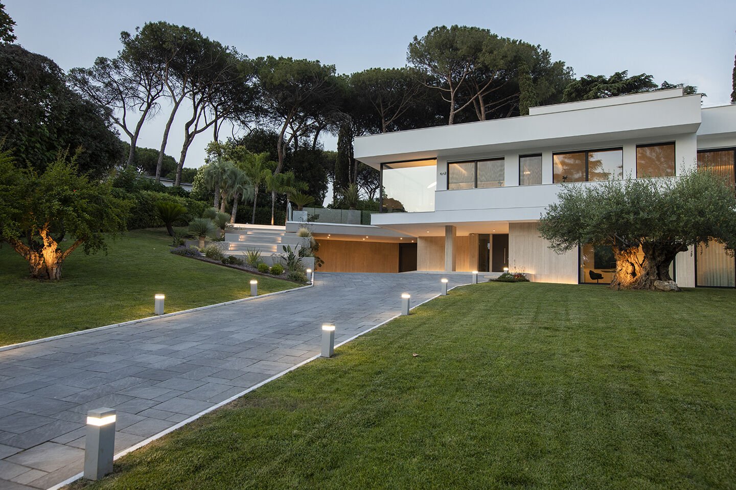 Mặt tiền biệt thự Villa FL tại Rome với khối nhà trắng hiện đại, lối vào lát đá xanh đen và hàng cây cổ thụ bao quanh. Thiết kế chú trọng tỷ lệ ngang và mảng kính lớn, giúp công trình vừa sang trọng vừa gắn kết với thiên nhiên
