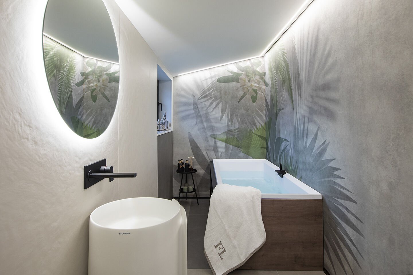 Phòng tắm thư giãn với bồn ngâm lớn và tường trang trí họa tiết lá nhiệt đới nhẹ nhàng. Ánh sáng hắt từ trần cùng gương tròn viền sáng giúp không gian trở nên yên bình, gợi cảm giác spa tại gia