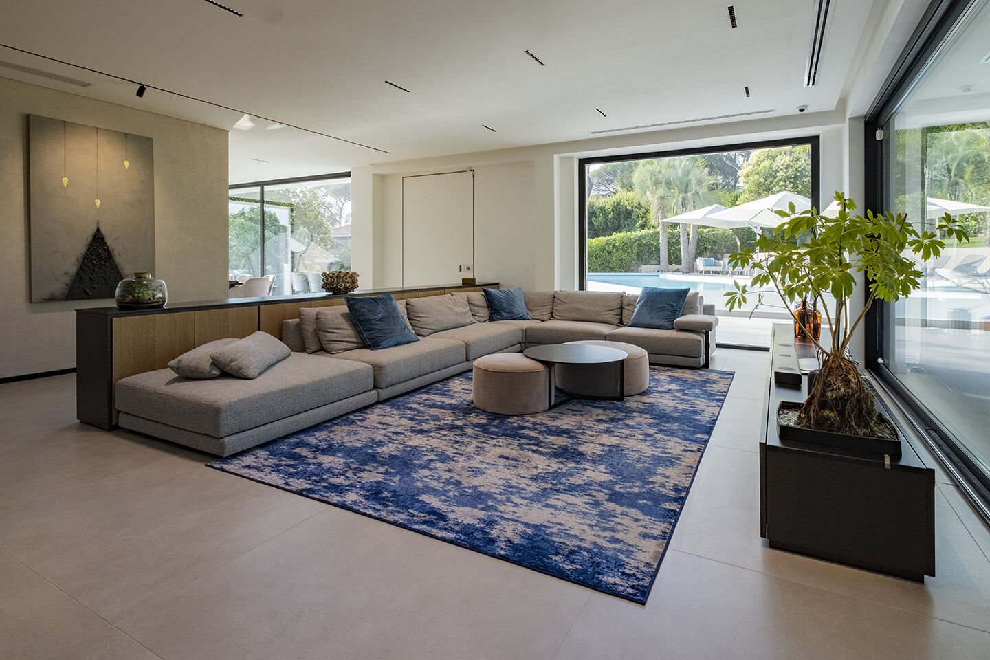 Phòng khách rộng thoáng với sofa chữ L màu be và thảm xanh tạo điểm nhấn thị giác mạnh mẽ. Các ô cửa kính lớn mở ra hướng hồ bơi giúp ánh sáng và cây xanh trở thành một phần của không gian sống