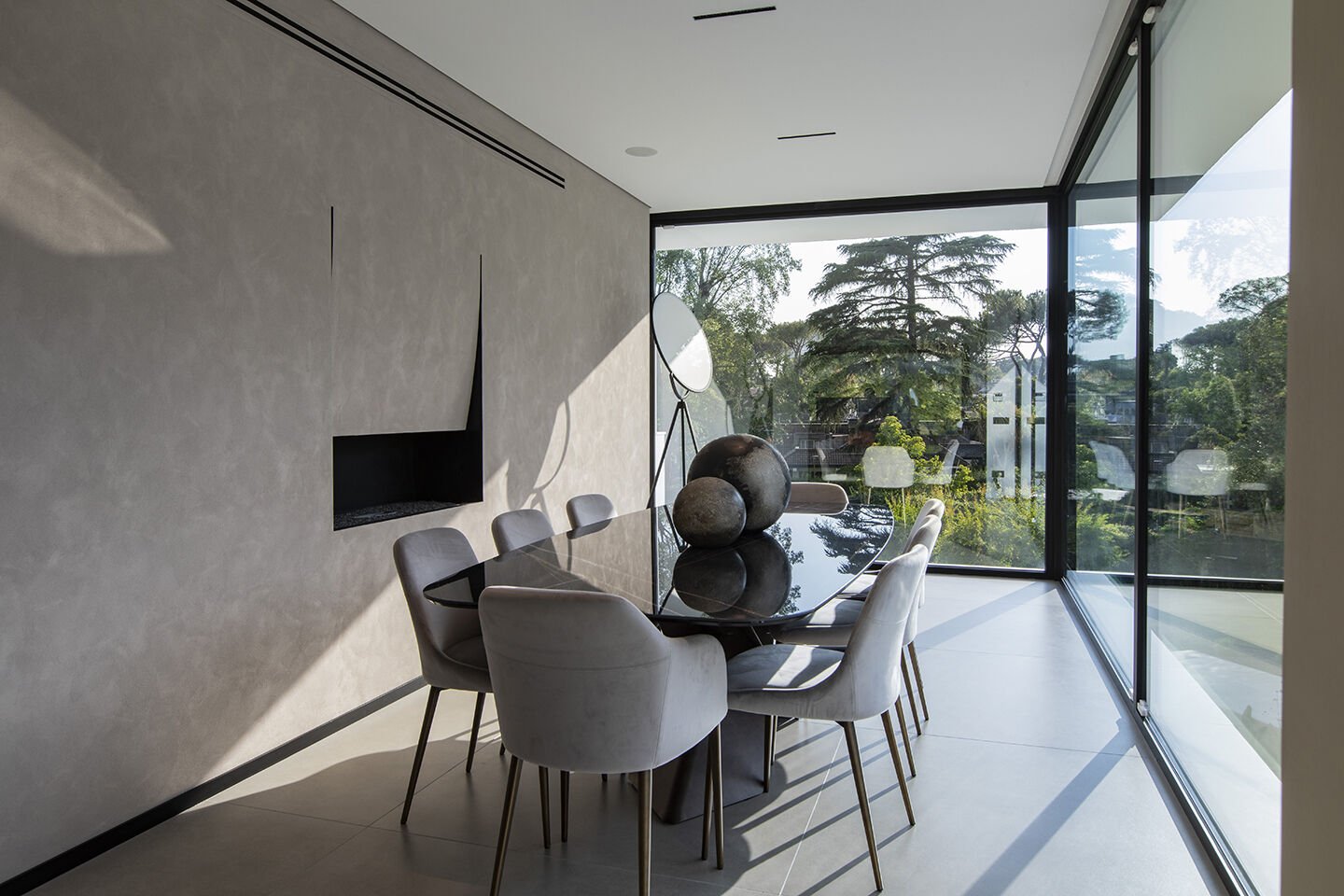 Phòng ăn trong nhà với bàn mặt kính đen, ghế bọc nhung sáng và khung kính panorama nhìn ra khu vườn. Sự tối giản tinh tế trong từng chi tiết thể hiện đúng tinh thần “kiến trúc phục vụ cảm xúc”