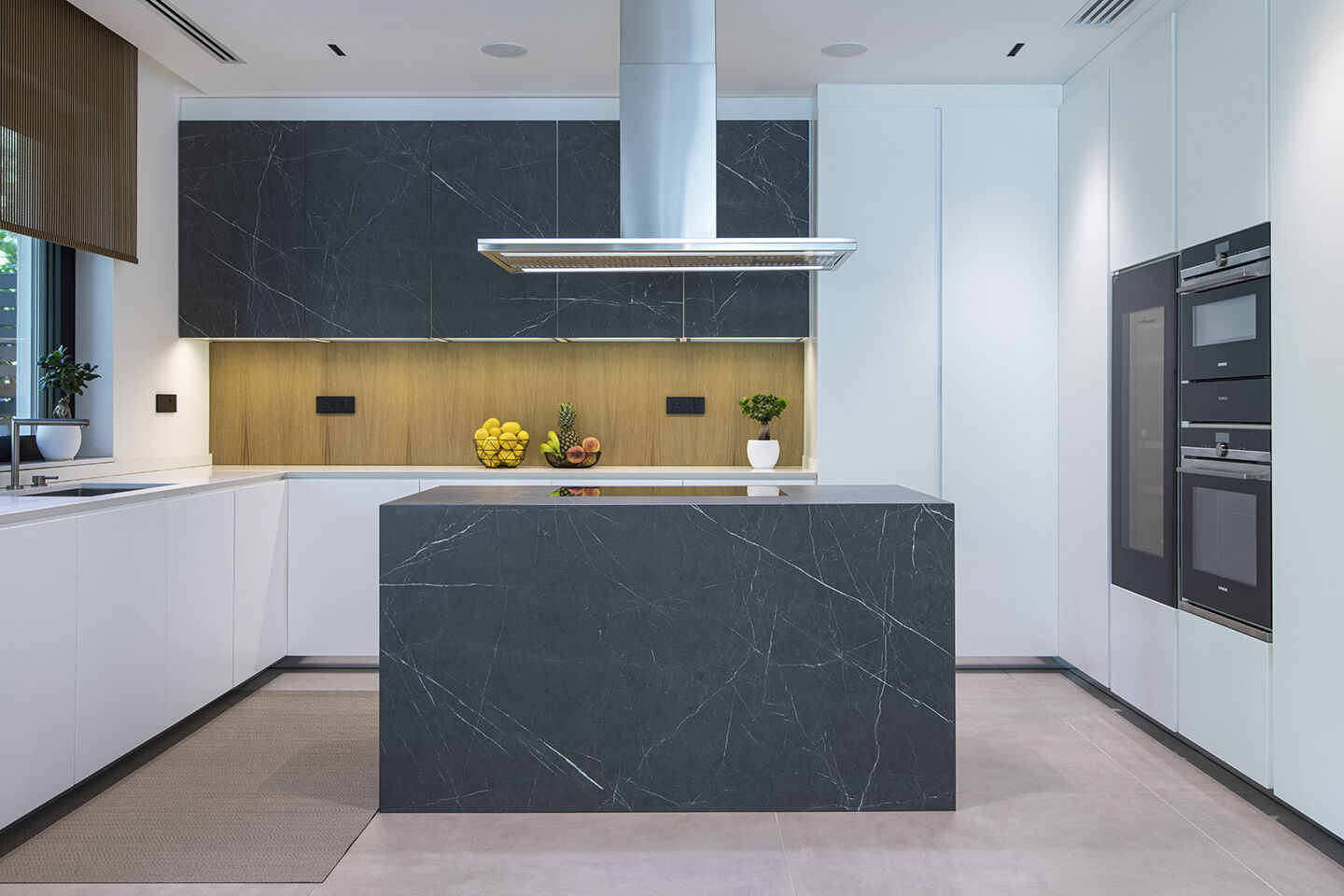 Góc nhìn cận bếp với đảo trung tâm phủ đá đen vân trắng và tường ốp gỗ sáng phía sau. Ánh sáng vàng nhẹ từ hệ đèn hắt làm dịu cảm giác lạnh của đá, mang đến vẻ sang trọng nhưng ấm áp