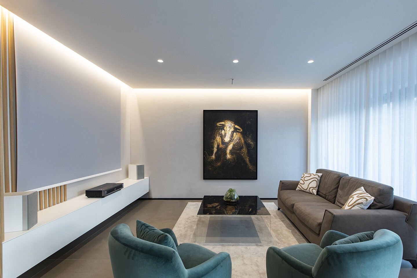 • Tạo chiều sâu bằng ánh sáng gián tiếp và bảng màu trung tính giúp không gian luôn nhẹ nhàng, thoáng đãng.