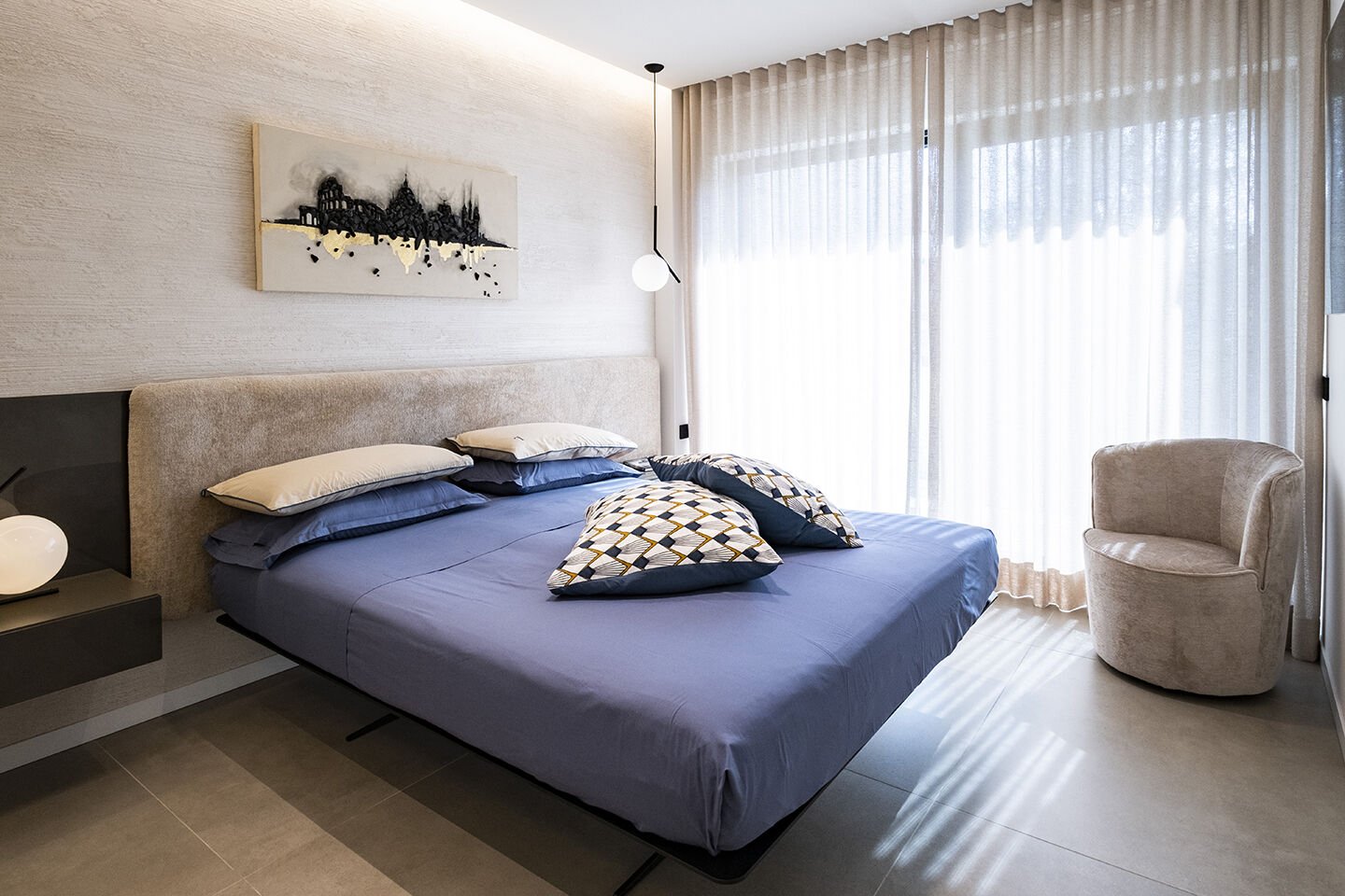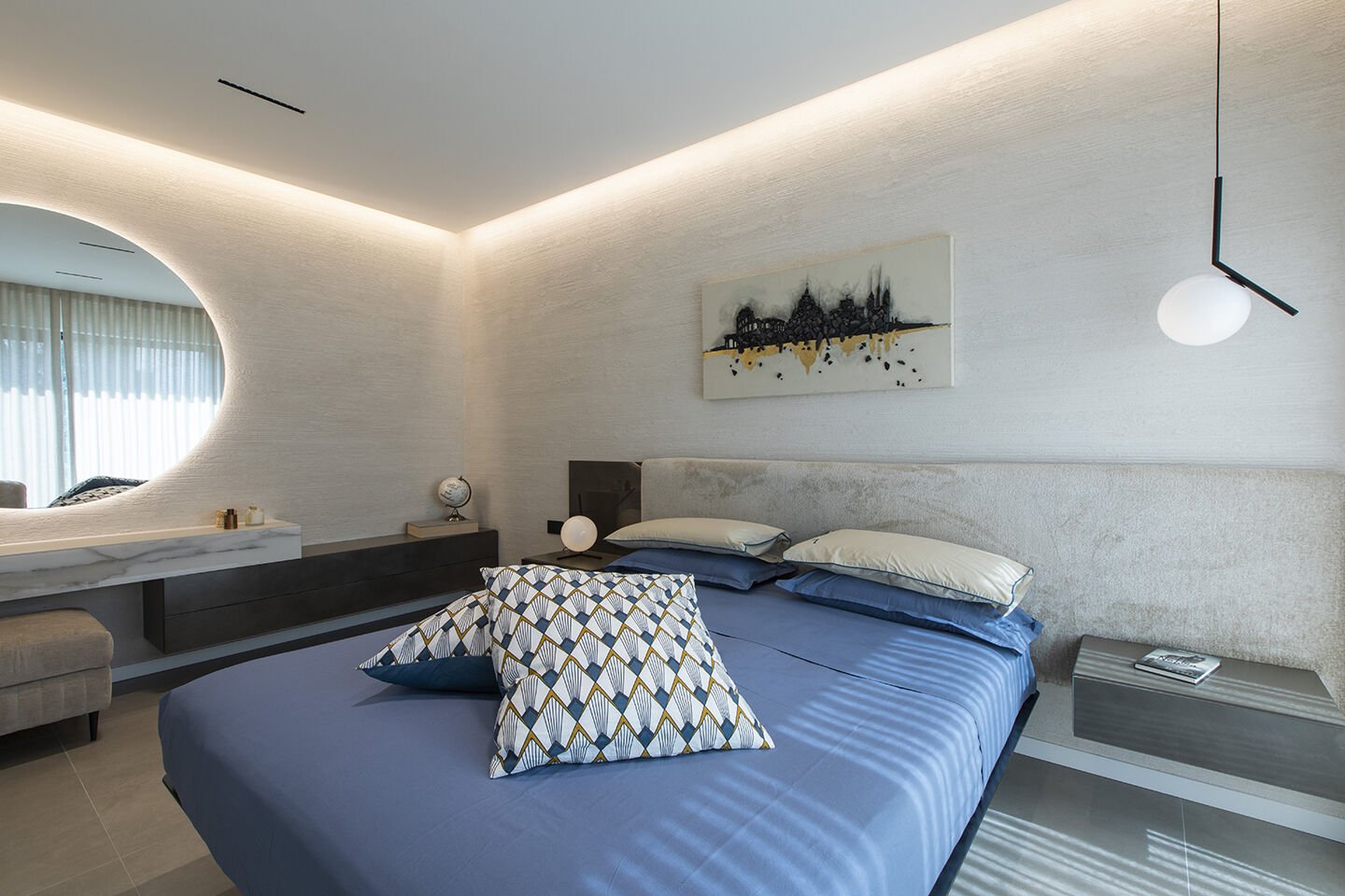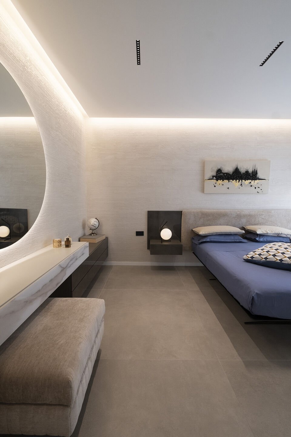 Phòng ngủ chính mang tông trung tính, nổi bật với ánh sáng hắt trần và gương tròn lớn tạo chiều sâu không gian. Mọi chi tiết đều được tối giản để tôn lên cảm giác thư thái và riêng tư