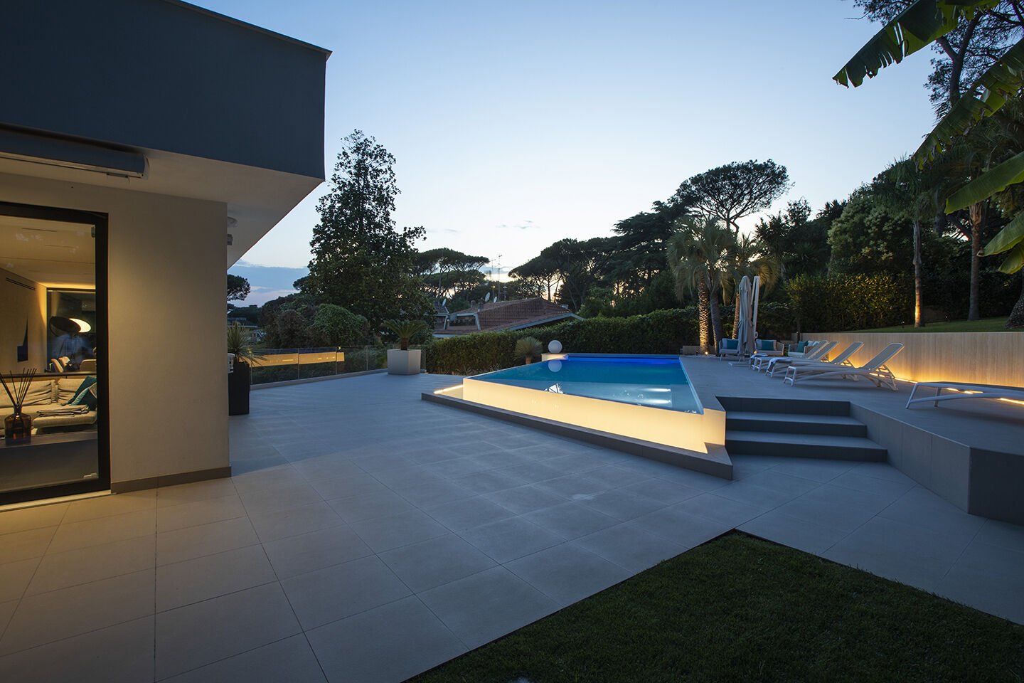 Cận cảnh hồ bơi vô cực nhìn ra thảm cây xanh của khu dân cư EUR. Thiết kế mép tràn và nền lát sáng màu giúp mặt nước hòa vào đường chân trời, làm mờ ranh giới giữa nhà và cảnh quan