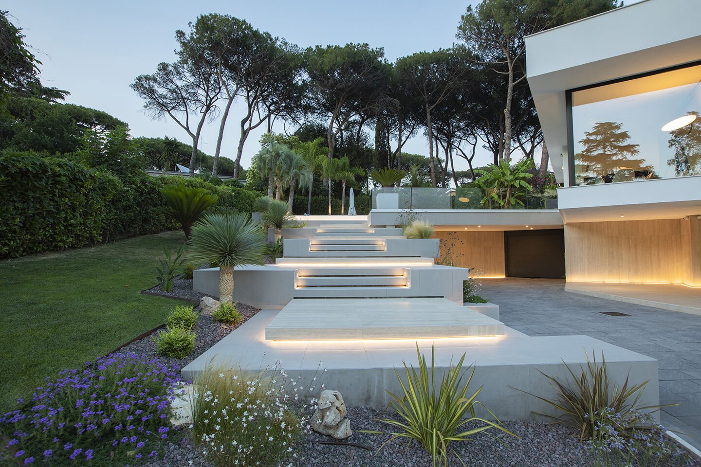 Góc nhìn nghiêng cho thấy cấu trúc hai tầng với hệ cửa kính panorama mở ra khung cảnh vườn xanh. Các bậc thang được gắn đèn hắt LED chạy viền, tạo hiệu ứng nổi khối và dẫn lối tinh tế về phía phòng khách