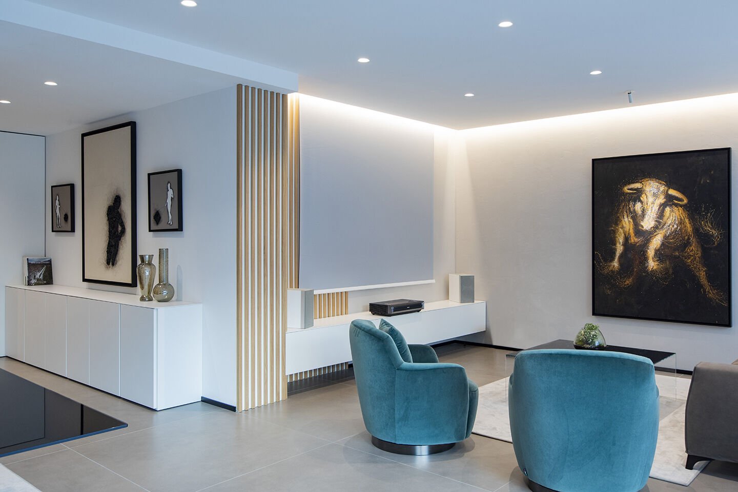 Không gian sinh hoạt phụ với ghế xoay nhung xanh ngọc và tranh nghệ thuật cỡ lớn trên nền tường sáng. Những đường lam gỗ dọc giúp phân tách không gian nhẹ nhàng, vẫn đảm bảo sự liên kết thị giác