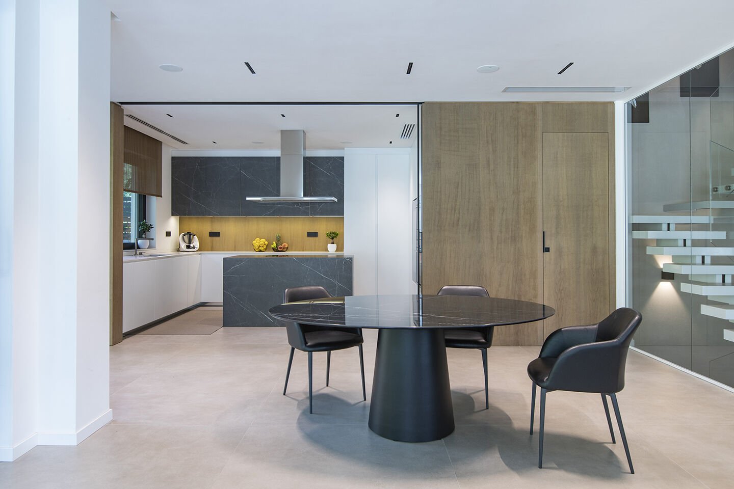 Không gian bếp và bàn ăn phụ kết nối mạch lạc bằng thiết kế mở. Sự kết hợp của tông gỗ ấm, đá đen và ánh sáng gián tiếp giúp căn bếp vừa hiện đại vừa gần gũi