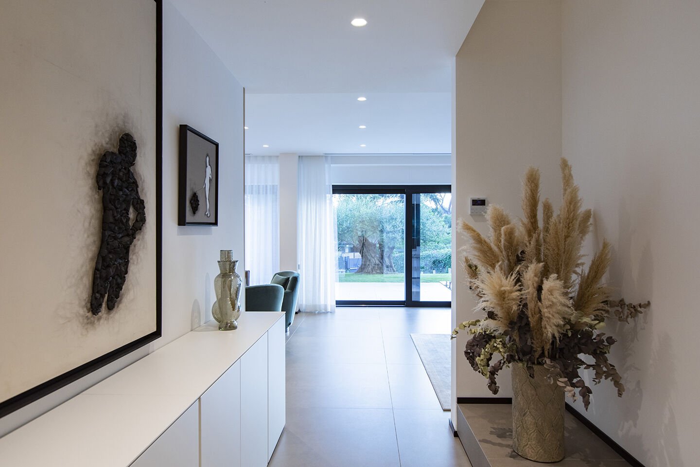 Sảnh nhỏ trong nhà được trang trí bằng tranh relief và bình hoa khô pampas, tạo điểm dừng thị giác mềm mại trước khi bước vào không gian sinh hoạt chính. Ánh sáng tự nhiên từ cửa kính lớn làm nổi bật sự cân bằng giữa nghệ thuật và kiến trúc