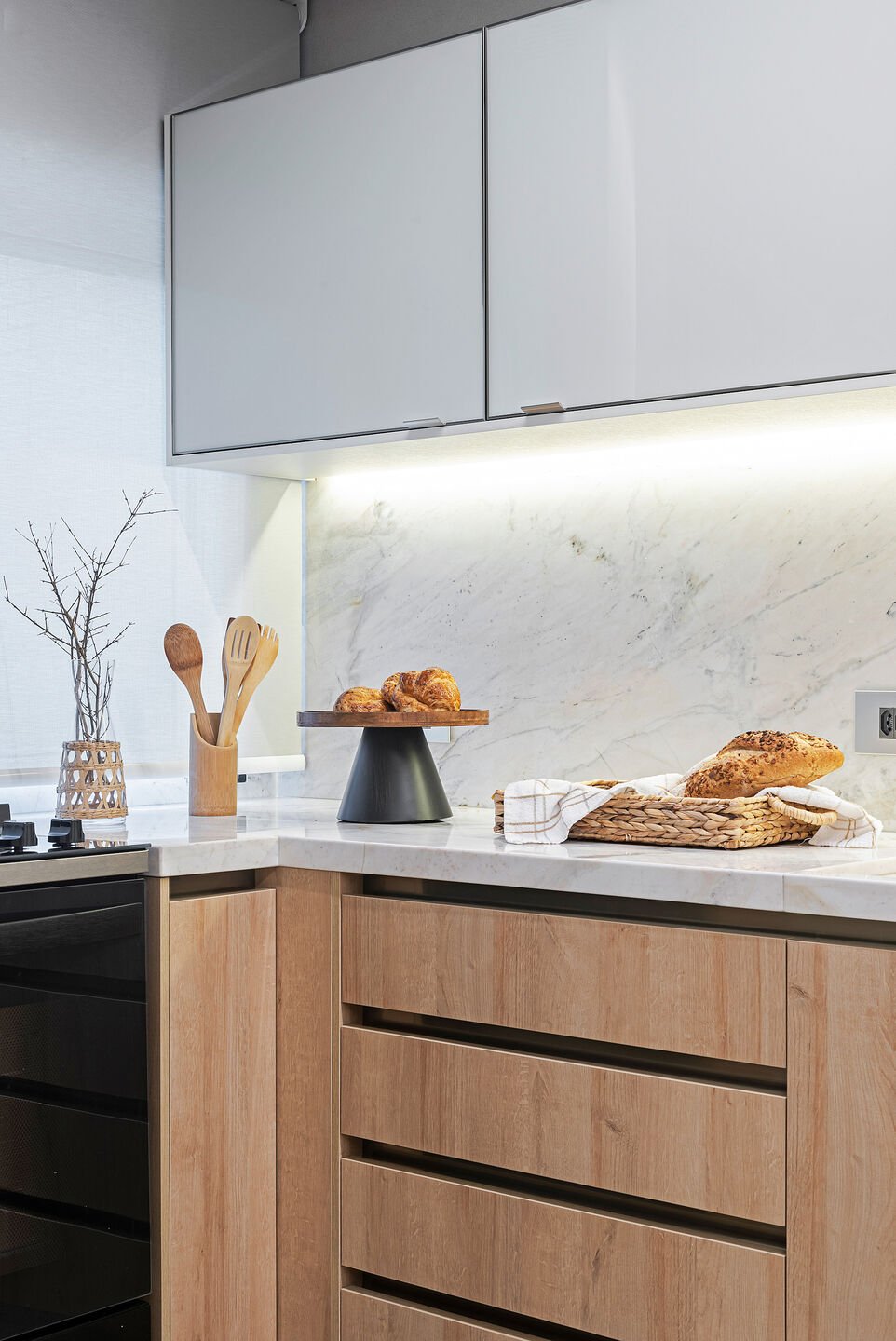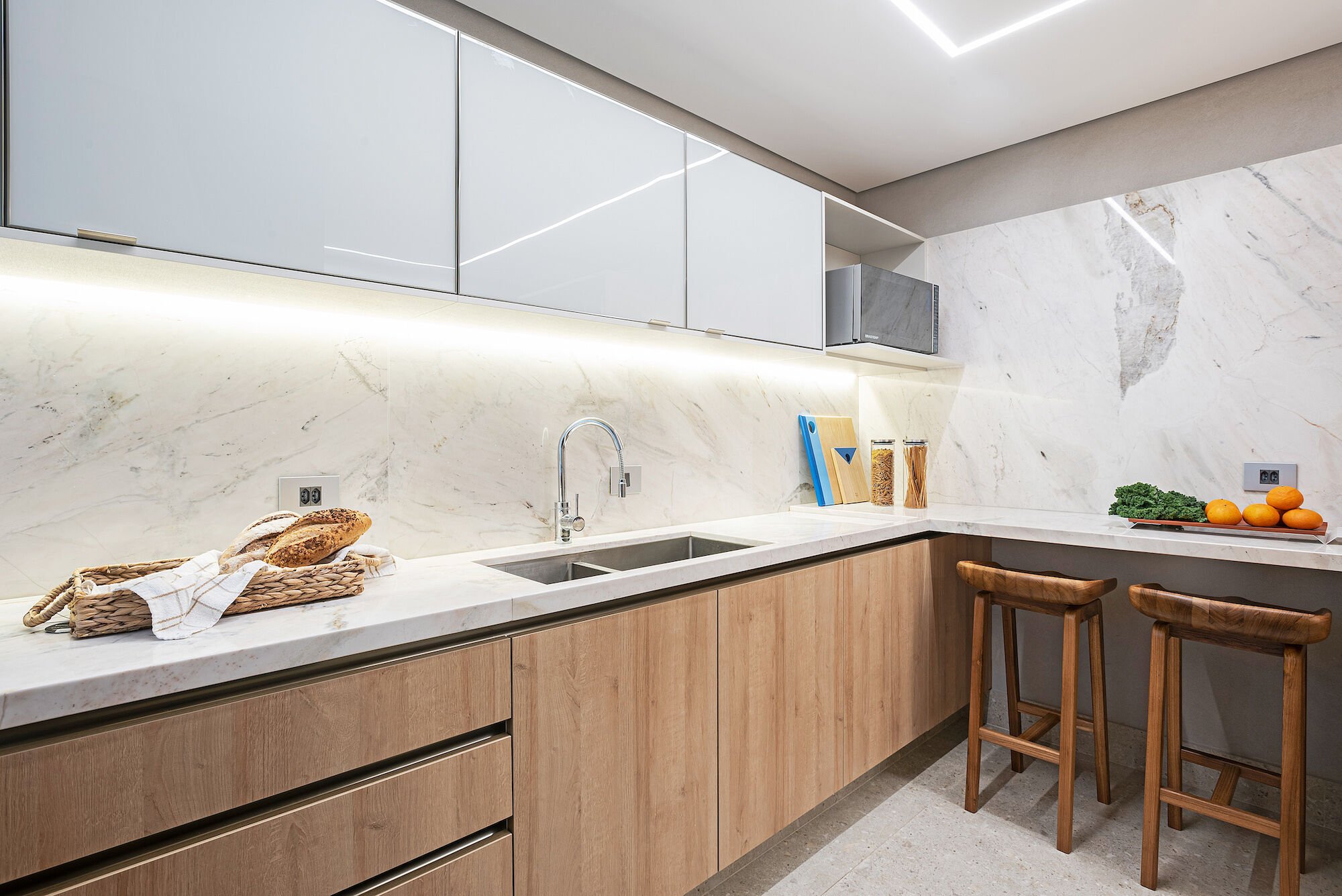 Không gian bếp sáng bừng với hệ tủ gỗ sồi sáng kết hợp mặt bàn đá marble trắng, mang lại cảm giác thanh lịch và hiện đại. Ánh sáng hắt tường giúp bề mặt đá nổi vân tự nhiên, tạo chiều sâu cho tổng thể