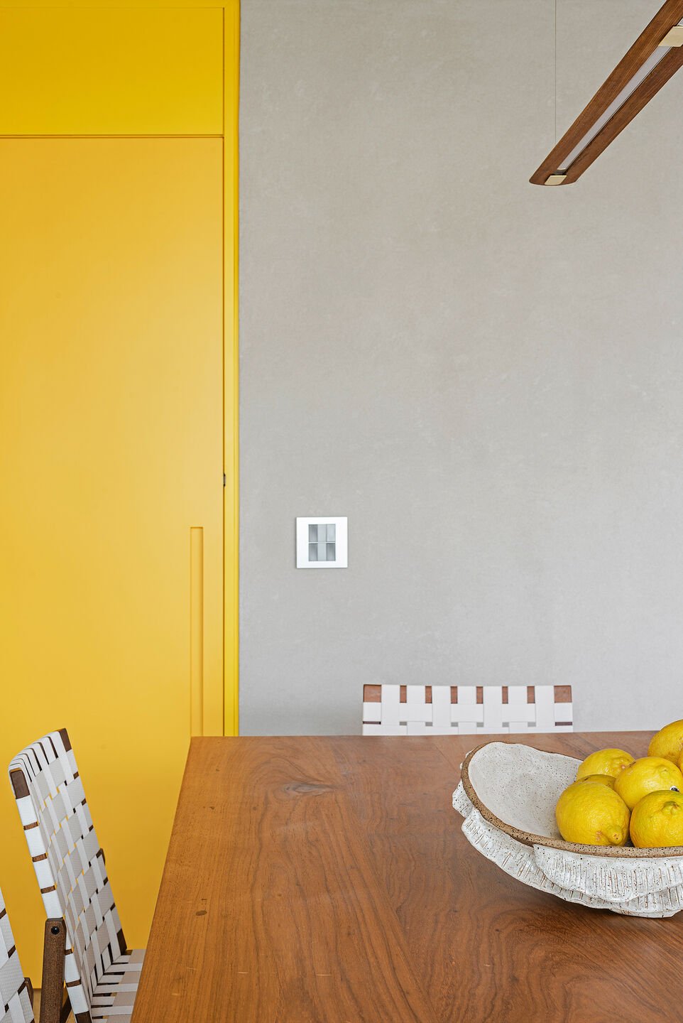 Mảng tường vàng rực rỡ bên cạnh bàn ăn gỗ, tạo nên điểm nhấn tươi vui giữa bảng màu trung tính. Bát gốm thủ công đựng chanh vàng càng làm nổi bật tinh thần tự nhiên và phóng khoáng của không gian