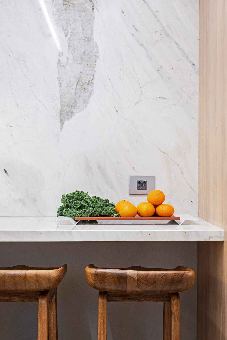 Chi tiết bàn bar nhỏ được ốp đá marble cùng hai ghế gỗ tiện thủ công, mang nét sang trọng mà vẫn thân thiện. Mâm cam và cải kale không chỉ tạo màu sắc sinh động mà còn gợi tinh thần sống xanh, tối giản