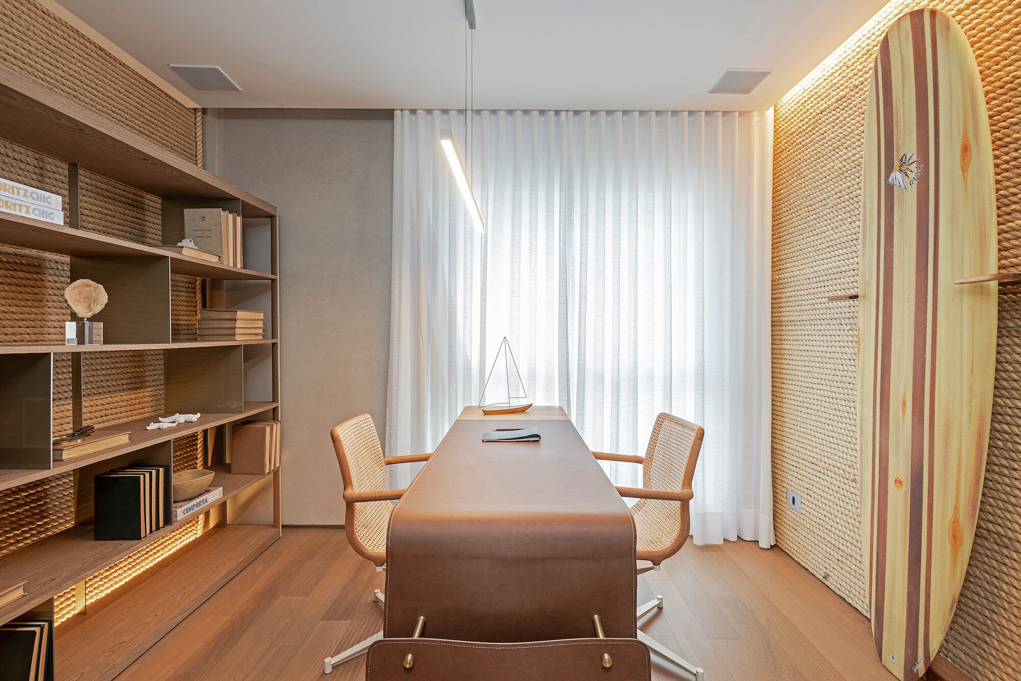 Toàn cảnh phòng làm việc cho thấy sự cân bằng hoàn hảo giữa công năng và cảm xúc. Ván lướt sóng dựng đứng cùng mảng tường dây thừng tạo nên nét riêng không thể nhầm lẫn của căn hộ mang tinh thần biển cả