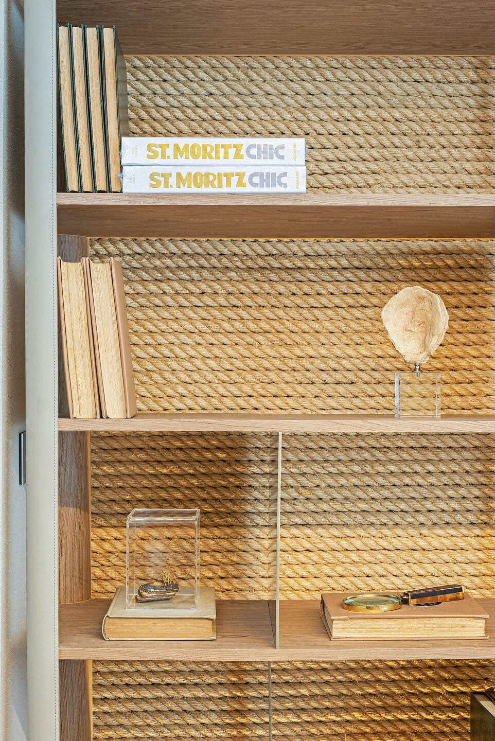 Dây thừng được dùng làm lớp hoàn thiện bề mặt tường, vừa trang trí vừa hấp thụ âm thanh, tạo cảm giác ấm cúng. Ánh sáng hắt âm từ phía sau kệ khiến các sợi thừng nổi khối nhẹ, tạo chiều sâu thị giác mà không cần đến chi tiết rườm rà.