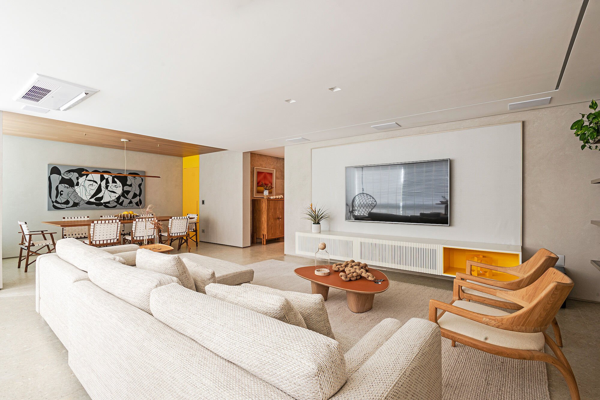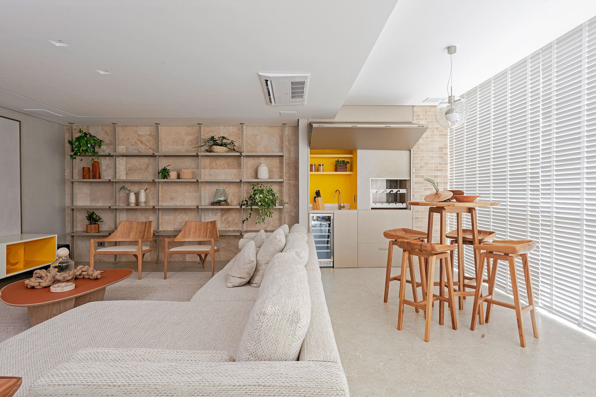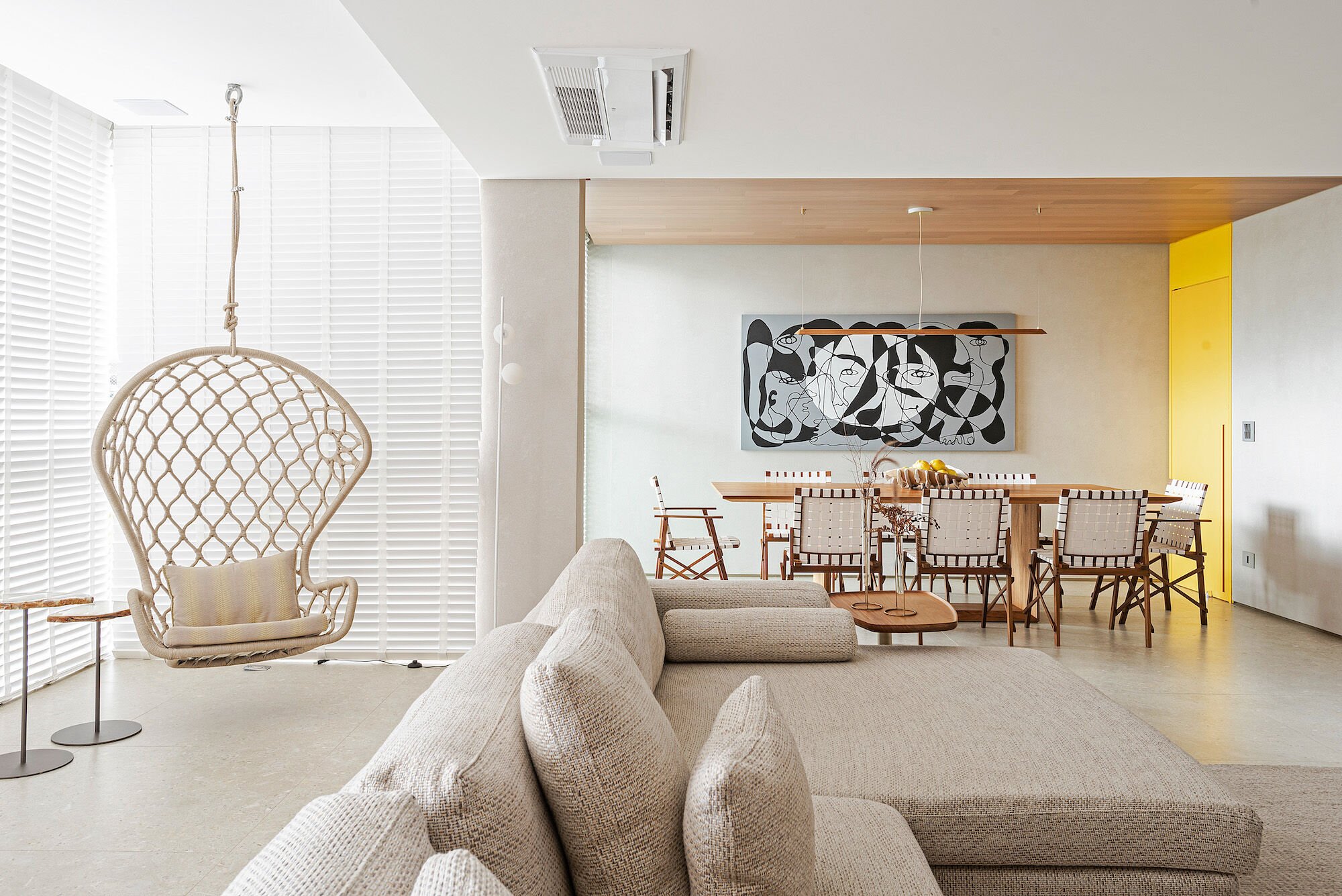 Phần nội thất được kết hợp từ nhiều nguồn: Ton Sur Ton Decorações, Artefacto, Inove Design và Jader Almeida - tất cả đều hướng đến sự tinh giản, hiện đại và hài hòa về màu sắc.