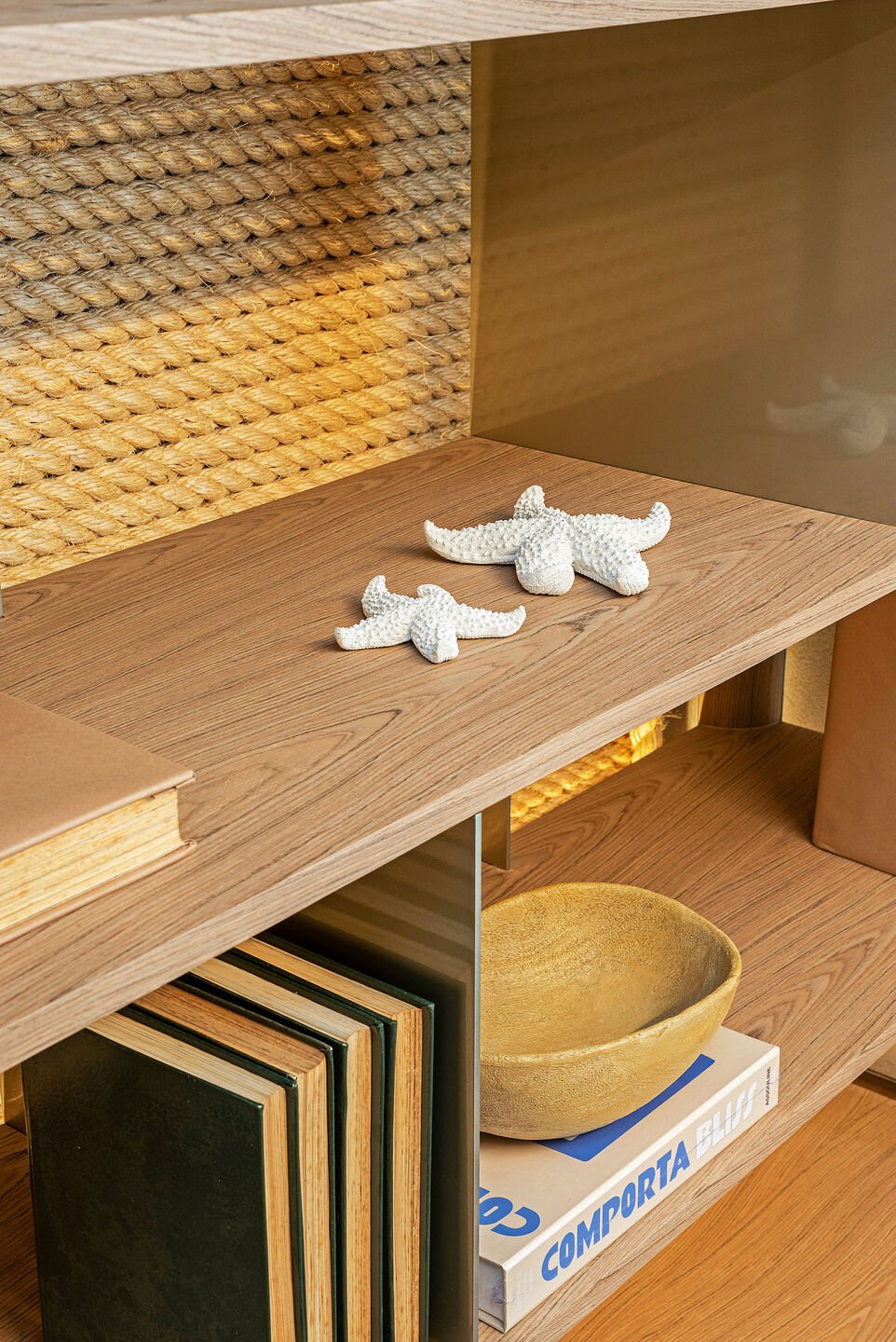 Những món đồ trang trí nhỏ như sao biển, vỏ sò, bát gốm hay sách nghệ thuật được phối hợp tinh tế để tái hiện không khí biển. Sự kết hợp giữa gỗ mộc và ánh sáng hắt nhẹ khiến từng chi tiết trở nên ấm áp, gần gũi