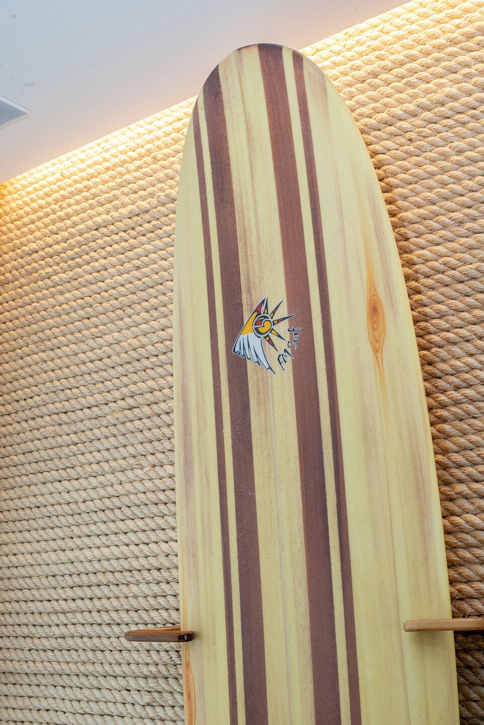 Chiếc ván lướt sóng với họa tiết gỗ tự nhiên được đặt giữa mảng tường dây thừng như một tác phẩm nghệ thuật. Ánh sáng vàng dịu hắt từ trên cao làm nổi bật bề mặt vật liệu, gợi cảm giác ấm áp và thân quen