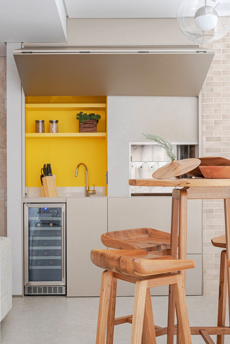 Từ góc nhìn này, khu bếp mini và phòng khách hòa quyện thành một thể thống nhất. Màu vàng tươi trong hốc bếp được dùng tiết chế, tạo cảm giác sinh động mà không phá vỡ sự tinh tế tổng thể
