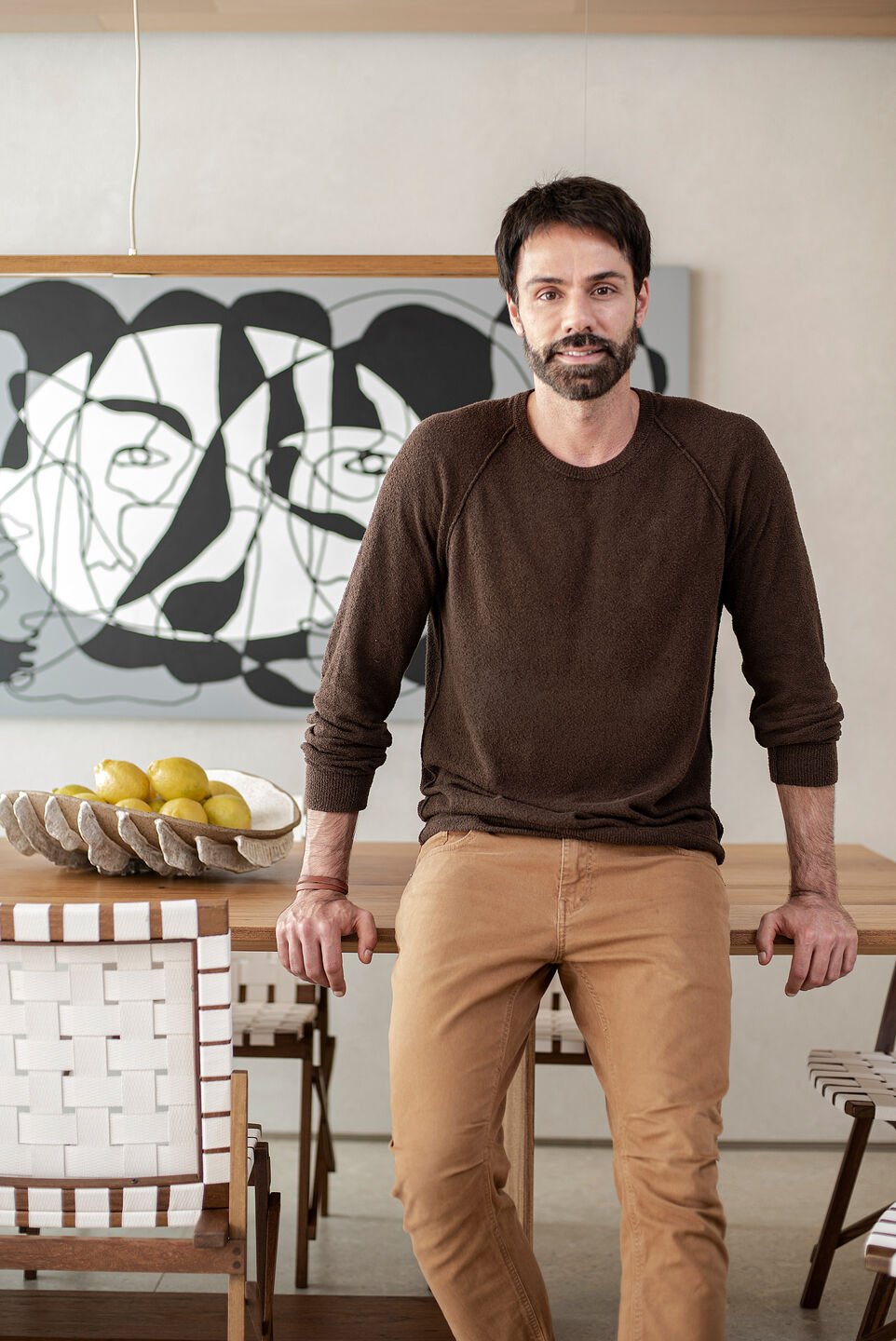 Chân dung kiến trúc sư dựa lưng vào bàn ăn trong không gian do chính anh thiết kế. Phía sau là bức tranh đen trắng biểu trưng cho phong cách nghệ thuật hiện đại mà căn hộ R159 theo đuổi - tinh tế, tự nhiên và đầy cá tính