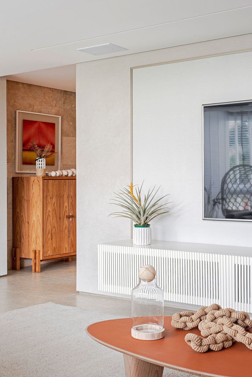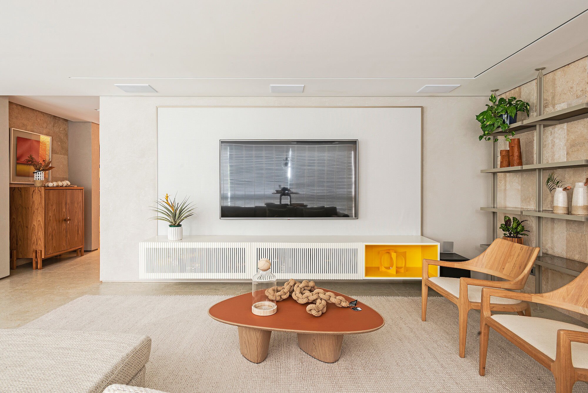 Góc cận kệ tường cho thấy cách Estúdio Elmor sử dụng vật liệu mộc và ánh sáng hắt để tạo độ sâu. Chiếc bàn trà nâu cam giữa phòng trở thành điểm tựa thị giác cho toàn bộ khu sinh hoạt