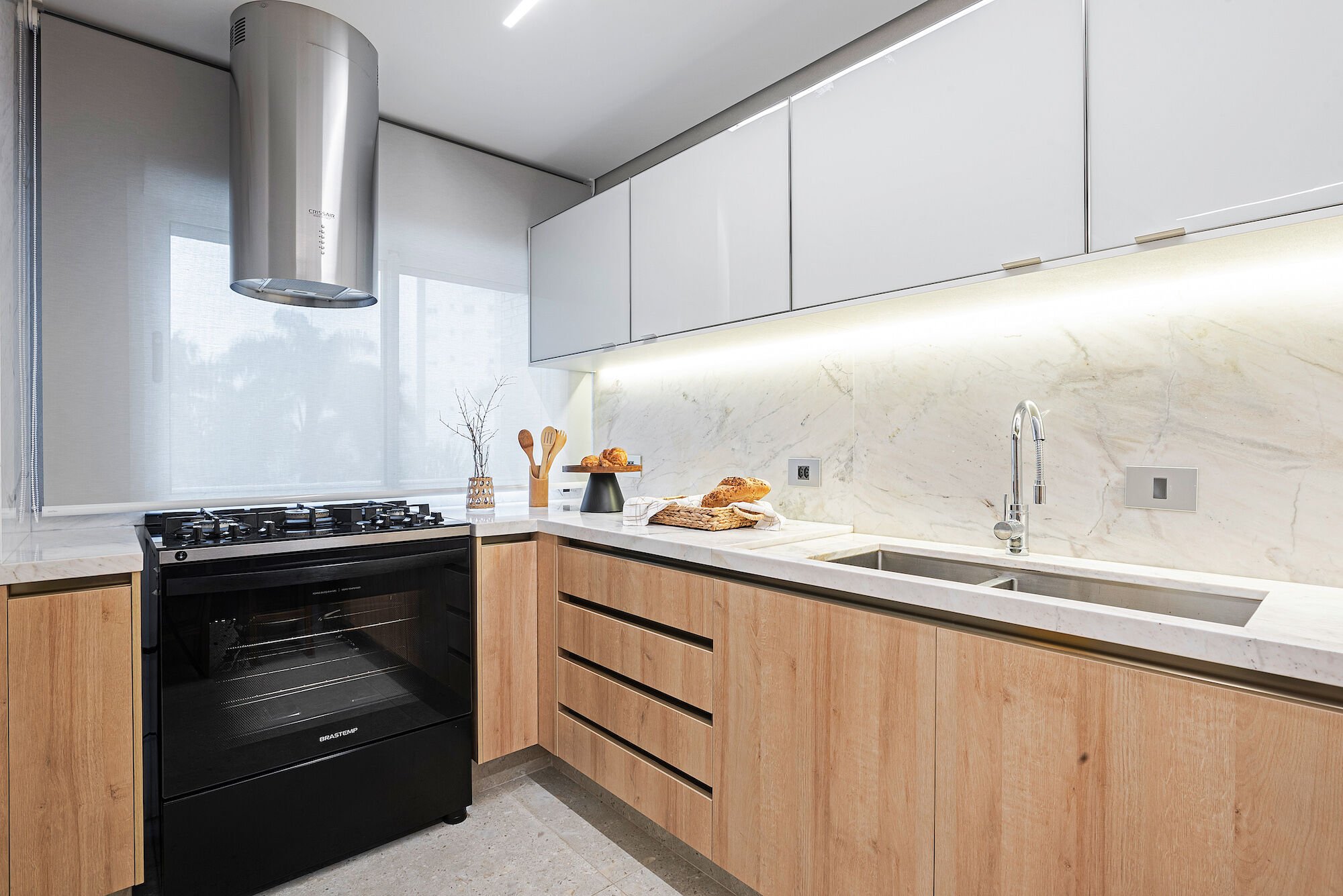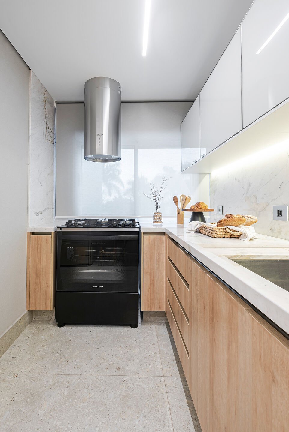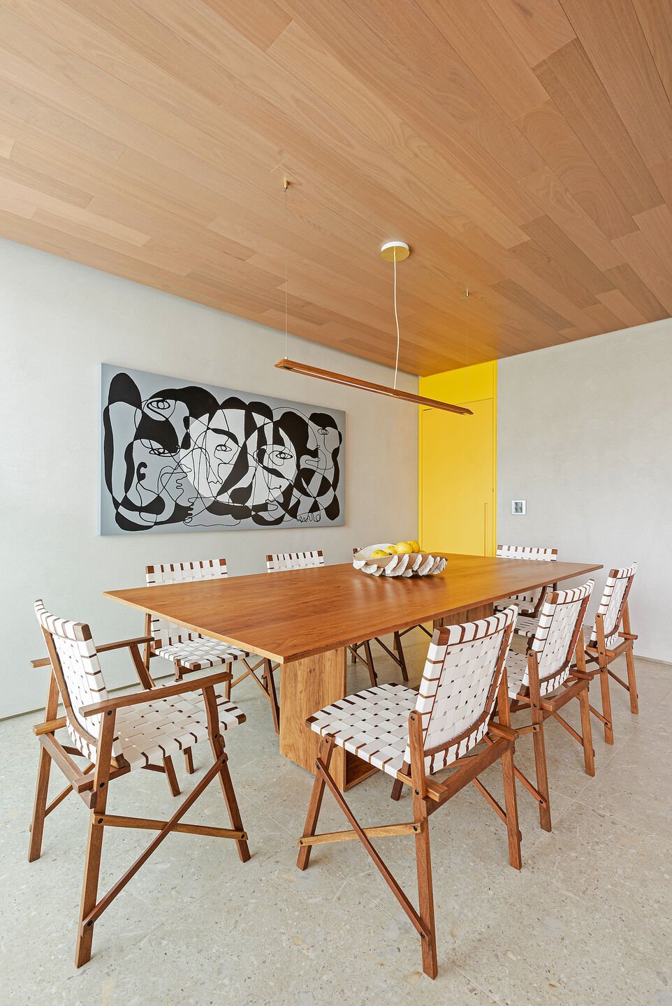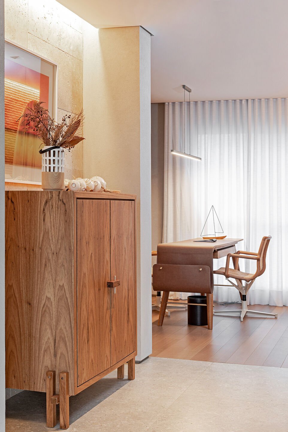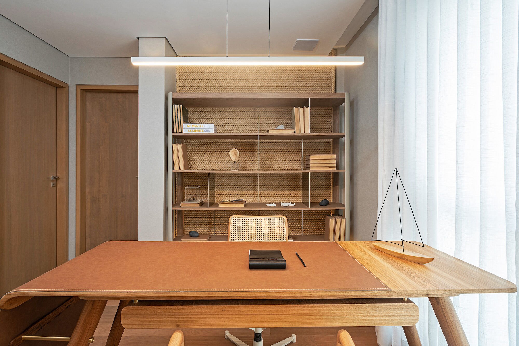 Trong căn hộ này, từng chi tiết đều được lựa chọn kỹ lưỡng. Sàn gỗ và trần do Indusparquet cung cấp, đảm bảo độ bền và sắc ấm tự nhiên. Đèn chiếu sáng đến từ các thương hiệu như Alma Light, Ana Neute và Guilherme Wentz, mang phong cách tối giản, tôn vinh ánh sáng tự nhiên.