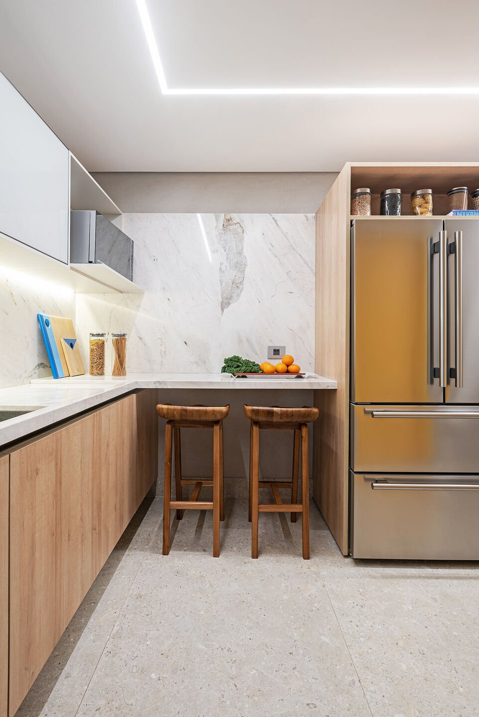 Góc bếp nhỏ gọn nhưng đầy tiện nghi với bàn đảo kết hợp ghế gỗ mộc. Đèn LED hắt trần và mảng đá marble vân tự nhiên mang lại cảm giác sang trọng, tinh tế mà vẫn gần gũi