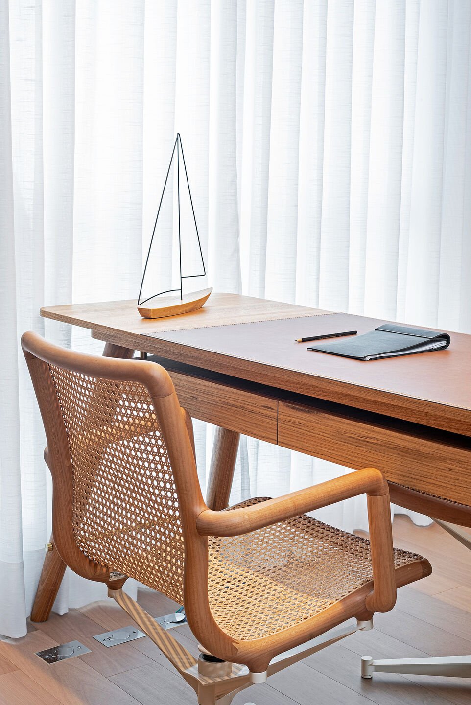 Chiếc ghế mây khung gỗ và bàn gỗ bọc da được đặt cạnh rèm trắng, nơi ánh sáng tự nhiên lan tỏa dịu dàng. Sự kết hợp giữa vật liệu tự nhiên và ánh sáng mềm giúp không gian trở nên nhẹ nhàng, yên tĩnh, phù hợp cho tập trung sáng tạo