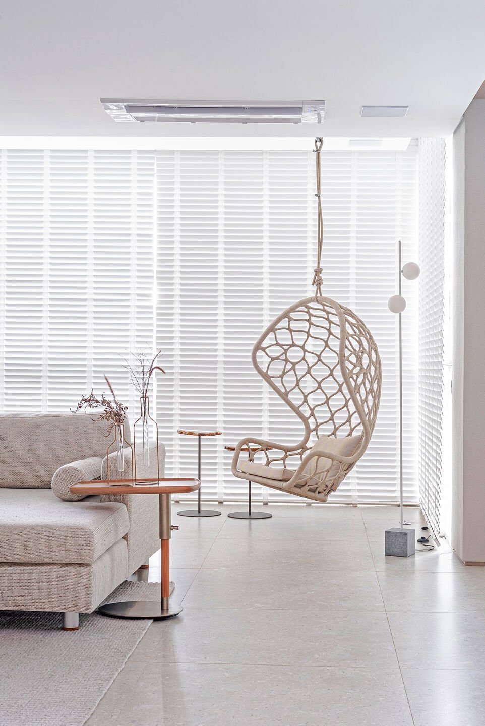 Chiếc ghế treo bằng dây thừng đan thủ công trở thành góc thư giãn đầy thi vị trong phòng khách. Ánh sáng tự nhiên xuyên qua lớp rèm mỏng khiến toàn bộ không gian như ngập tràn hơi thở biển