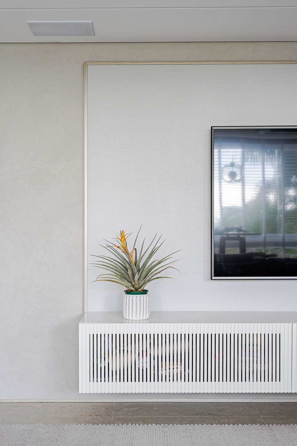 Chậu cây Strelitzia đơn sắc đặt cạnh tivi mang đến sức sống và nhịp điệu cho mảng tường phẳng. Thiết kế kệ tivi trắng với các thanh nan thưa giúp không gian nhẹ và thoáng hơn