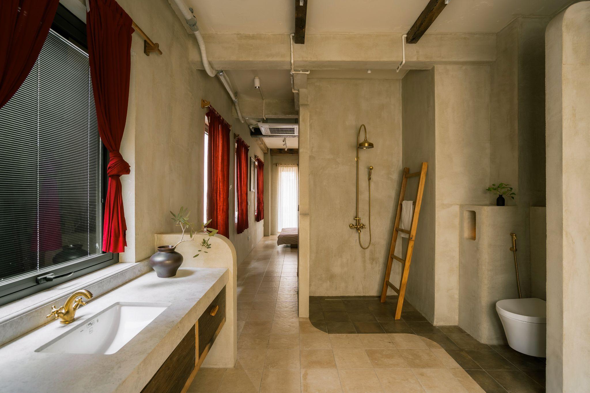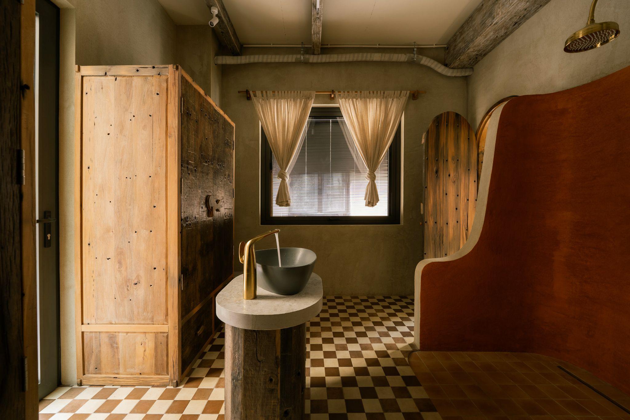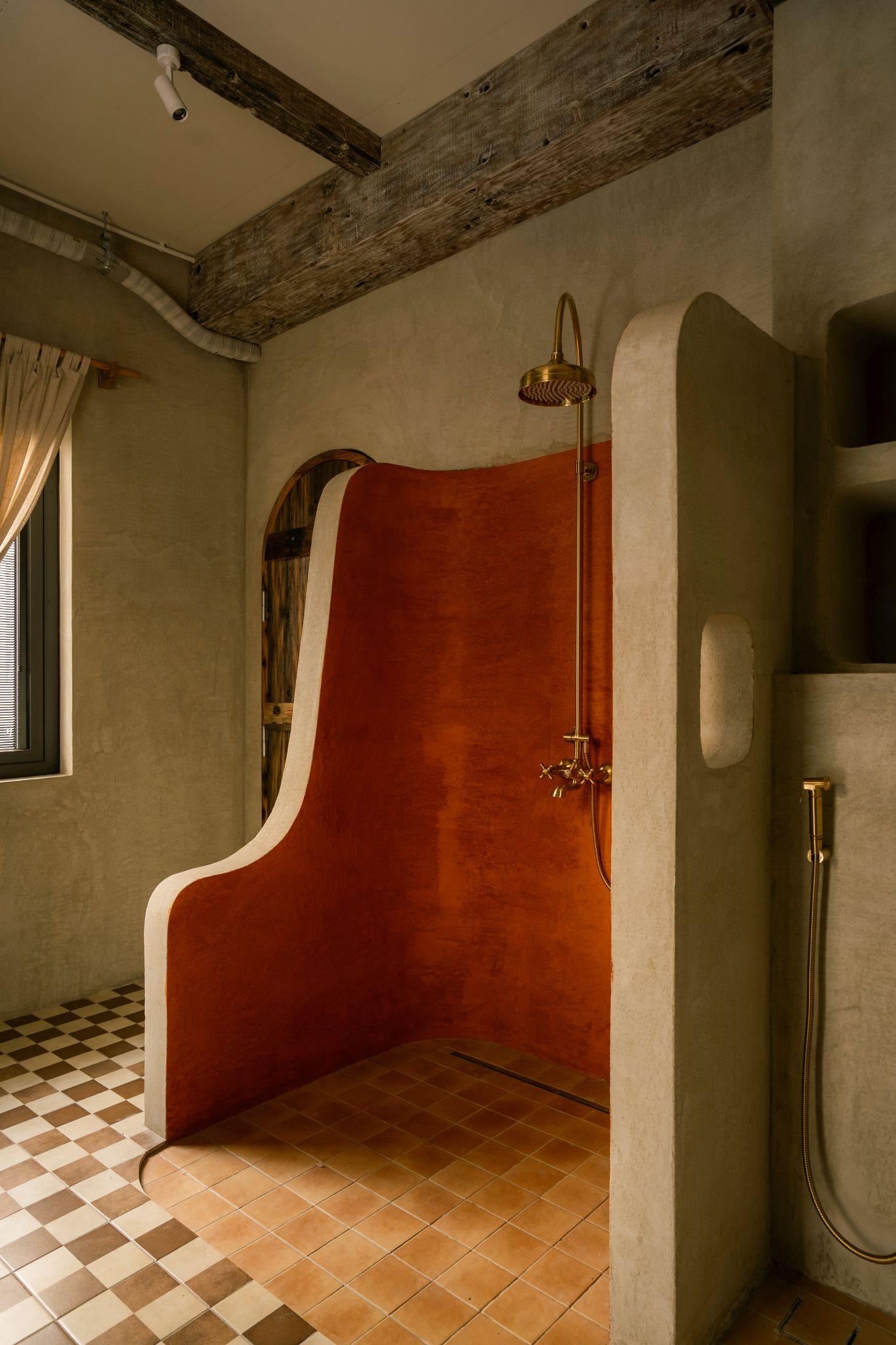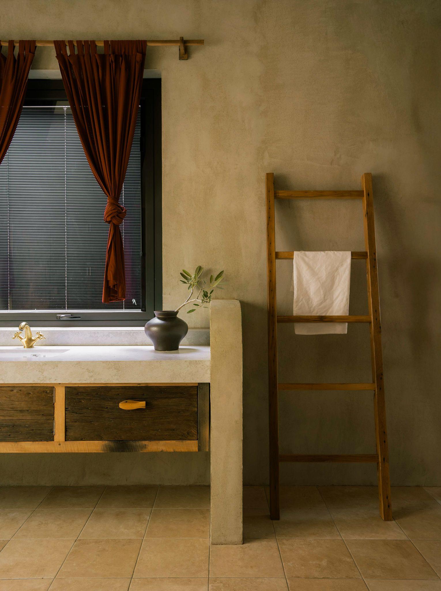 Phòng tắm Wabi-sabi mộc mạc với gỗ Táu tái sinh, ánh sáng ấm và sắc đỏ vải lanh tạo nên cảm giác yên bình