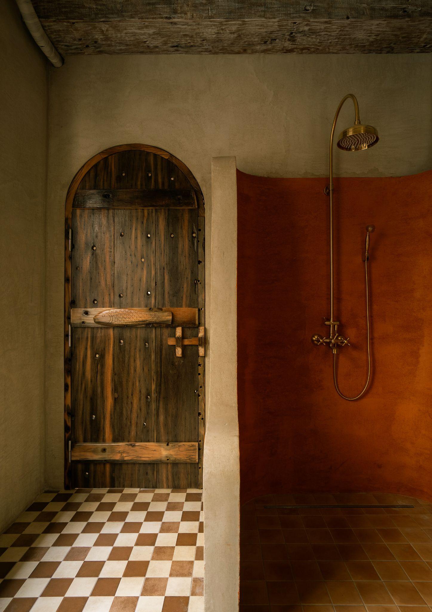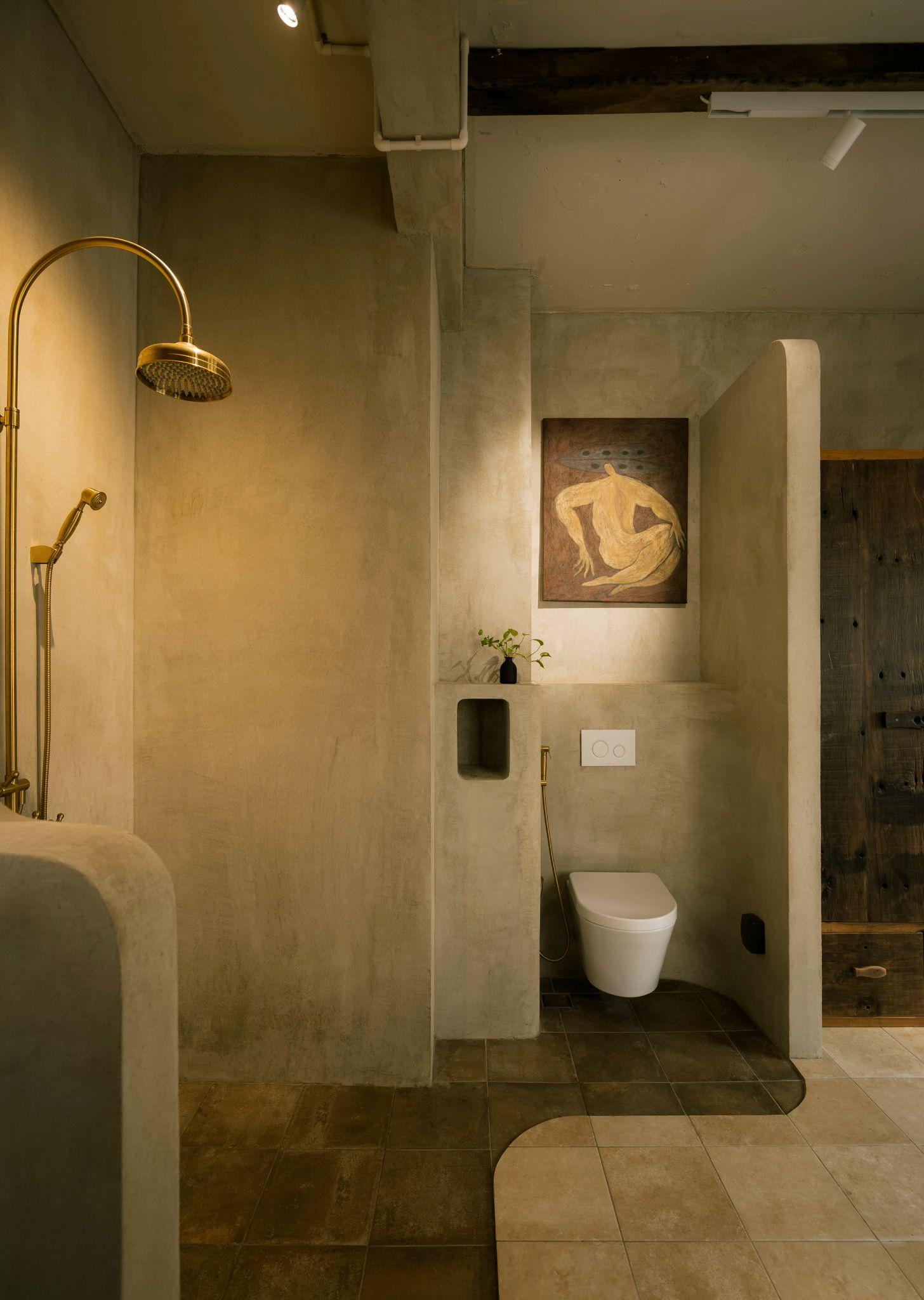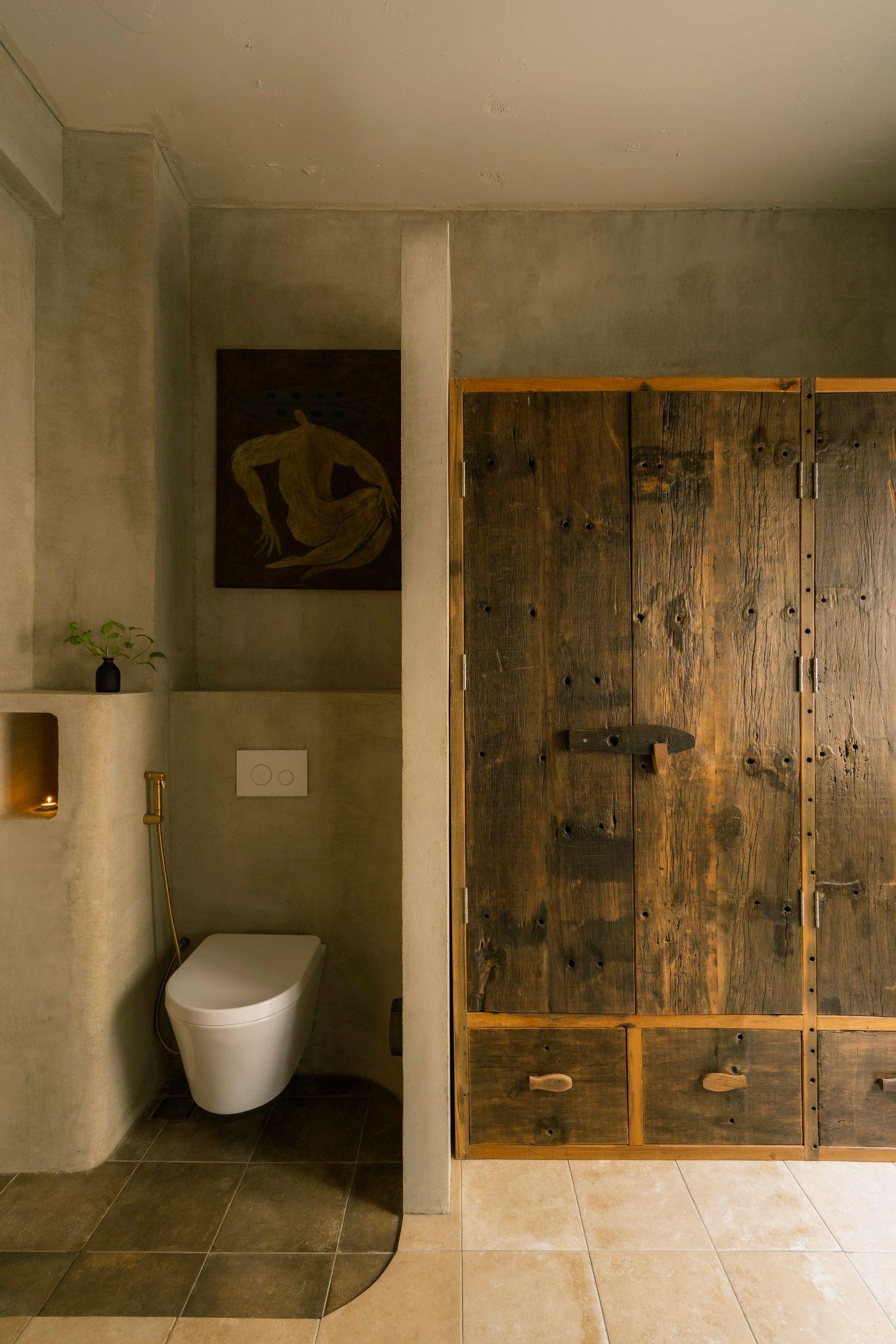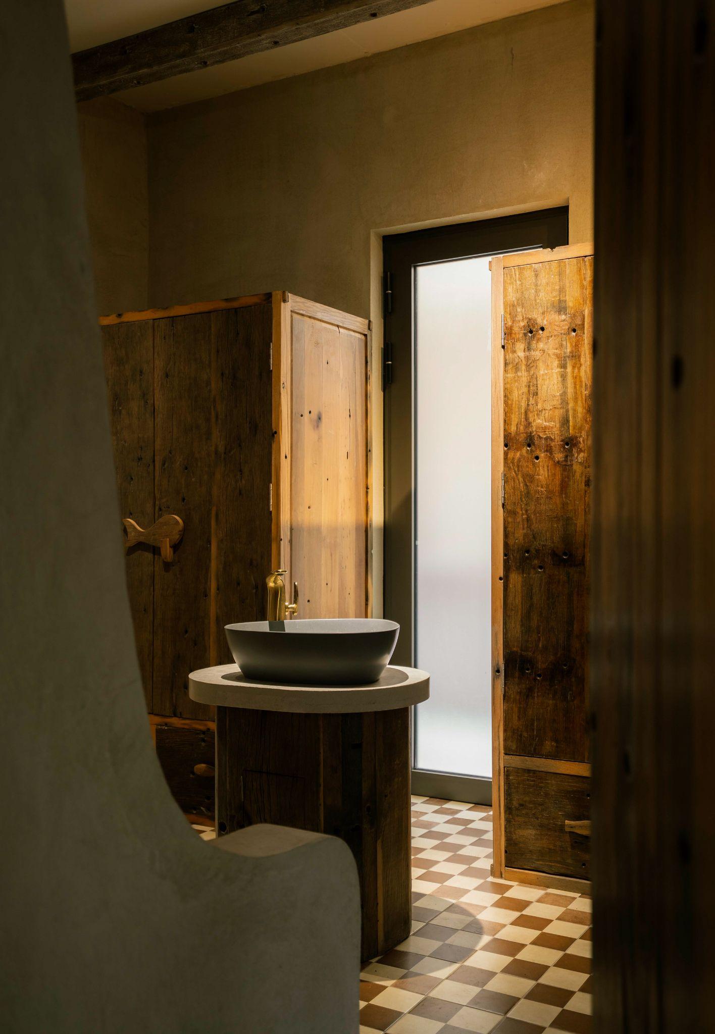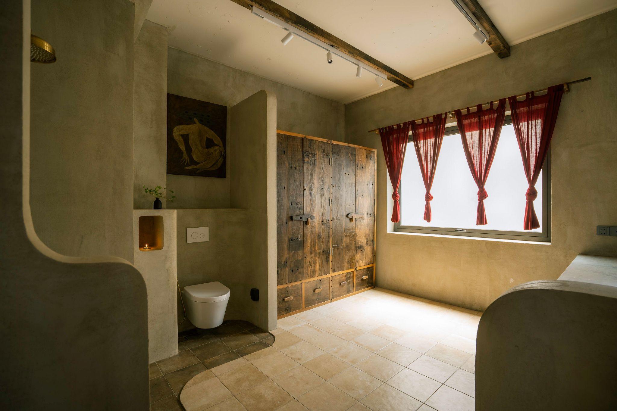 Phòng tắm Wabi-sabi mộc mạc với gỗ Táu tái sinh, ánh sáng ấm và sắc đỏ vải lanh tạo nên cảm giác yên bình