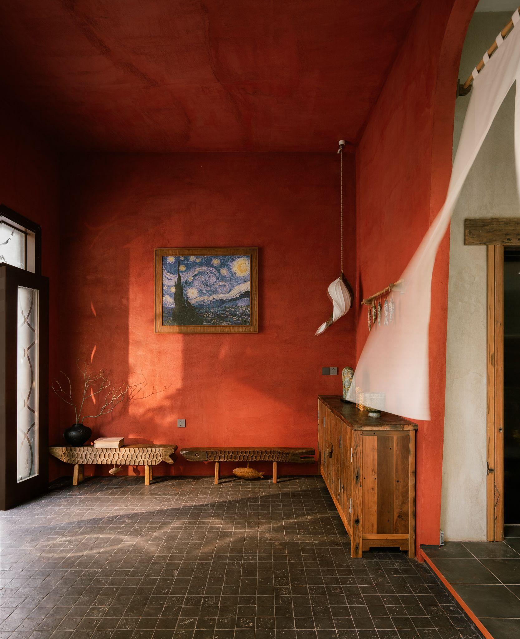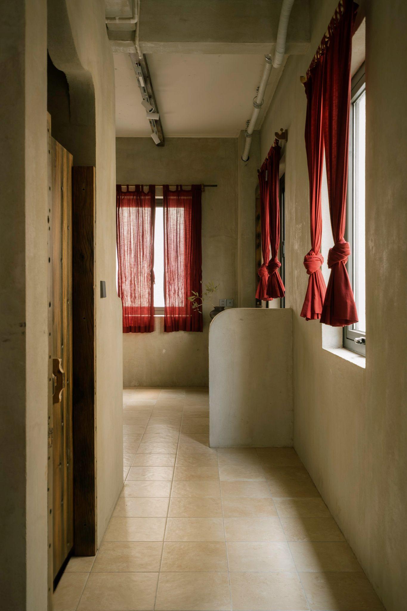 Ánh sáng xuyên qua lớp rèm đỏ, phủ lên từng mảng tường thô