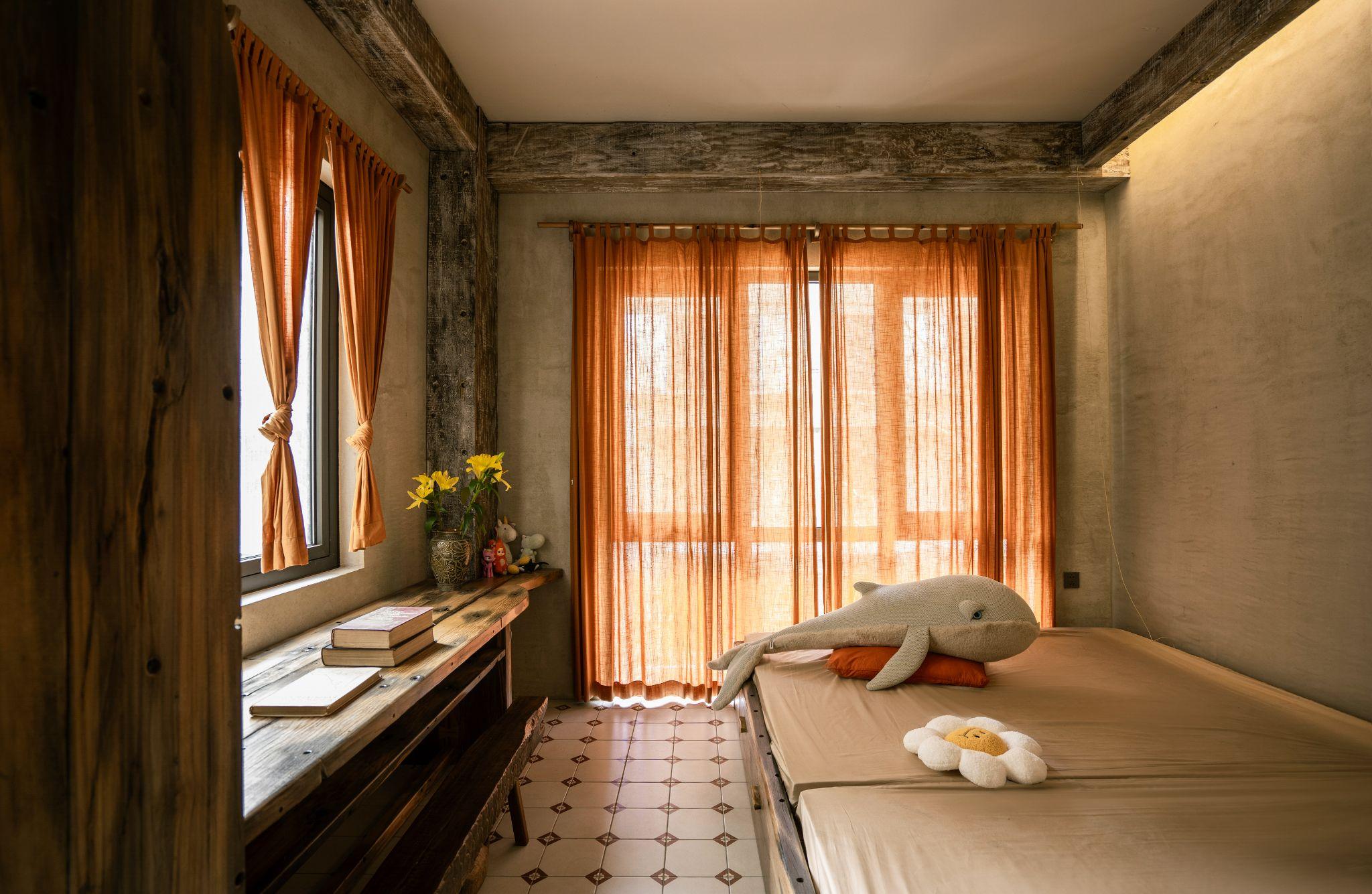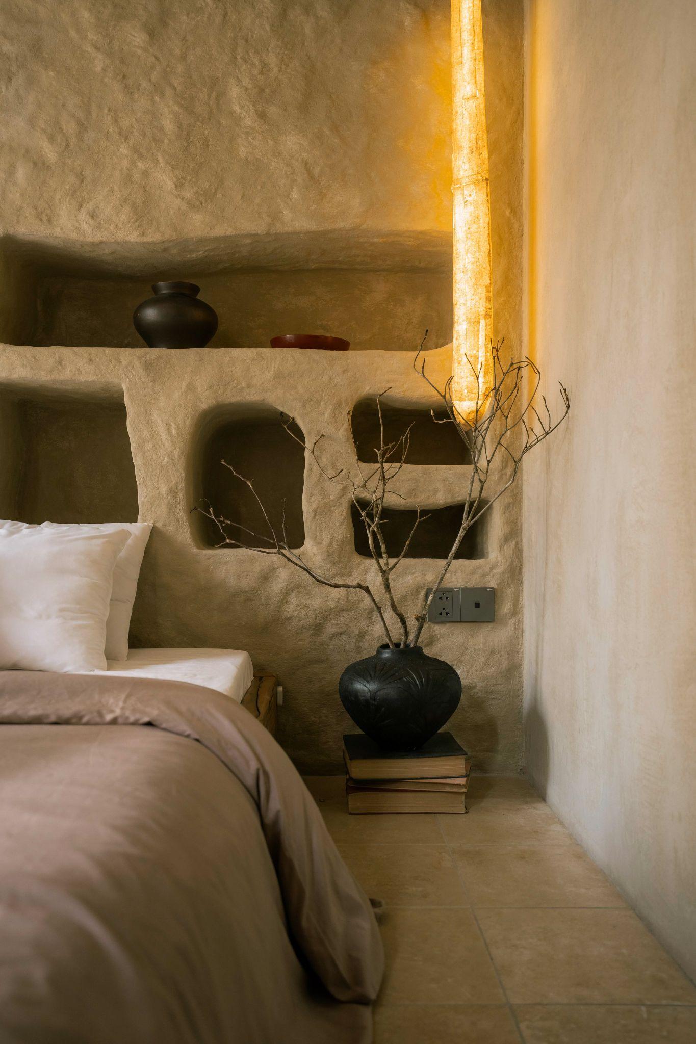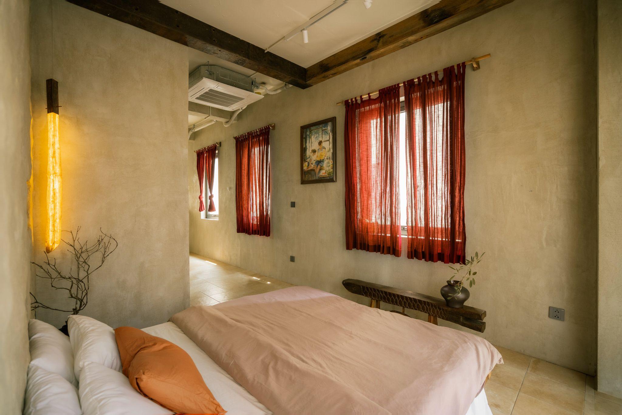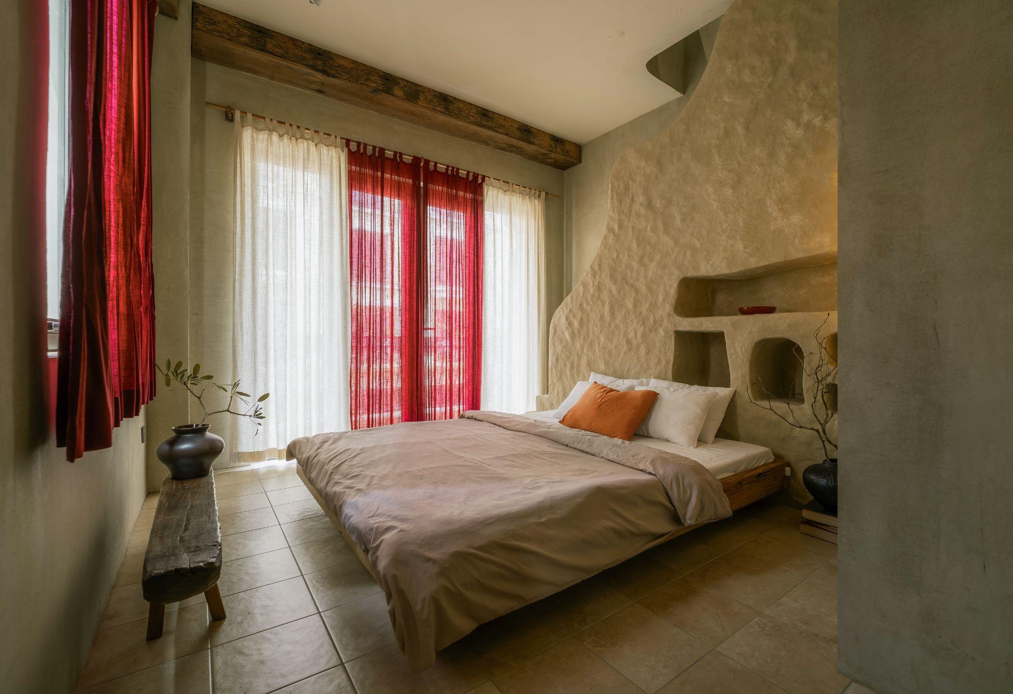 Phòng ngủ chan hòa ánh sáng, nơi vải lanh đỏ và mảng tường uốn lượn đậm chất Wabi-sabi