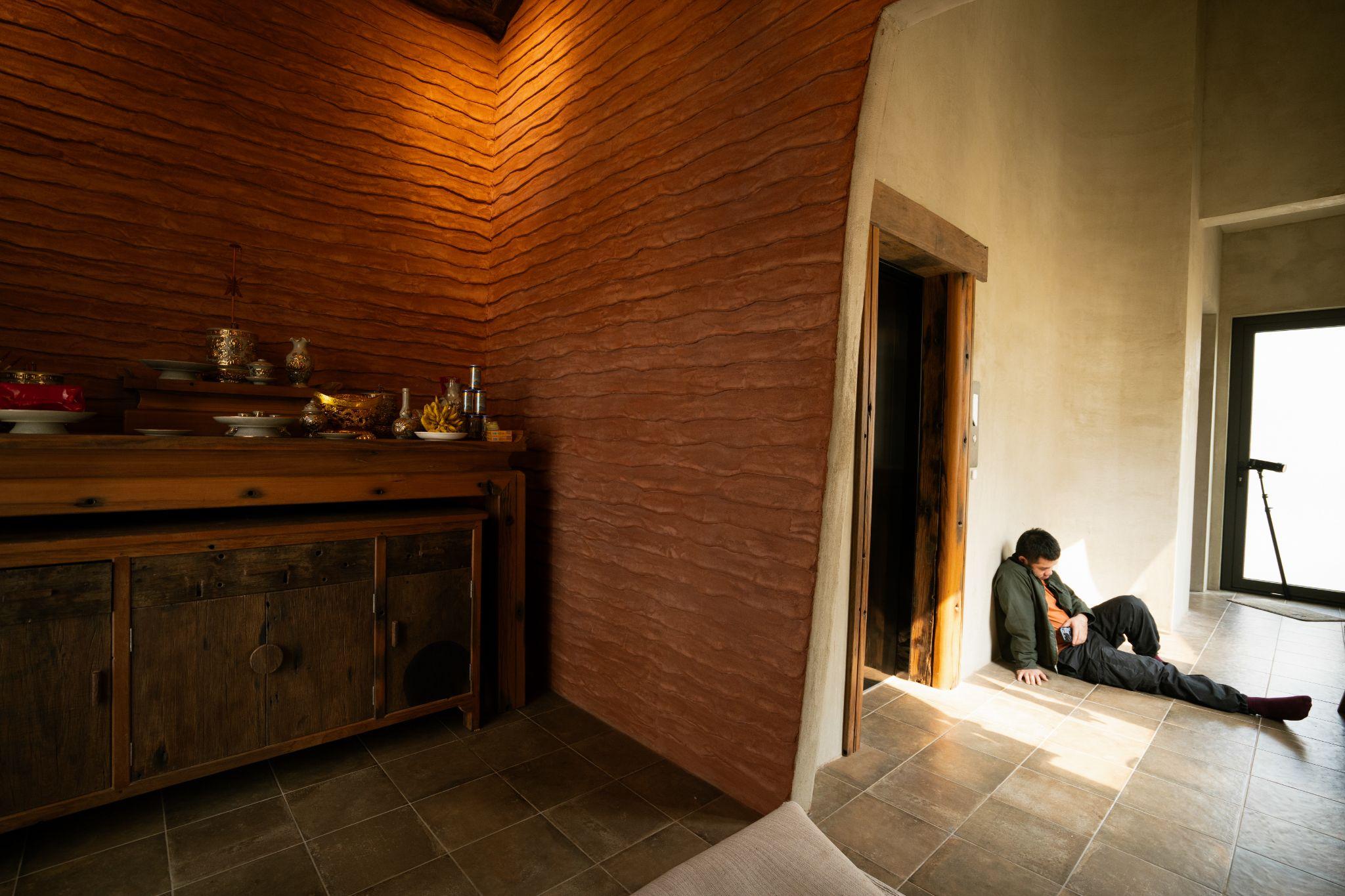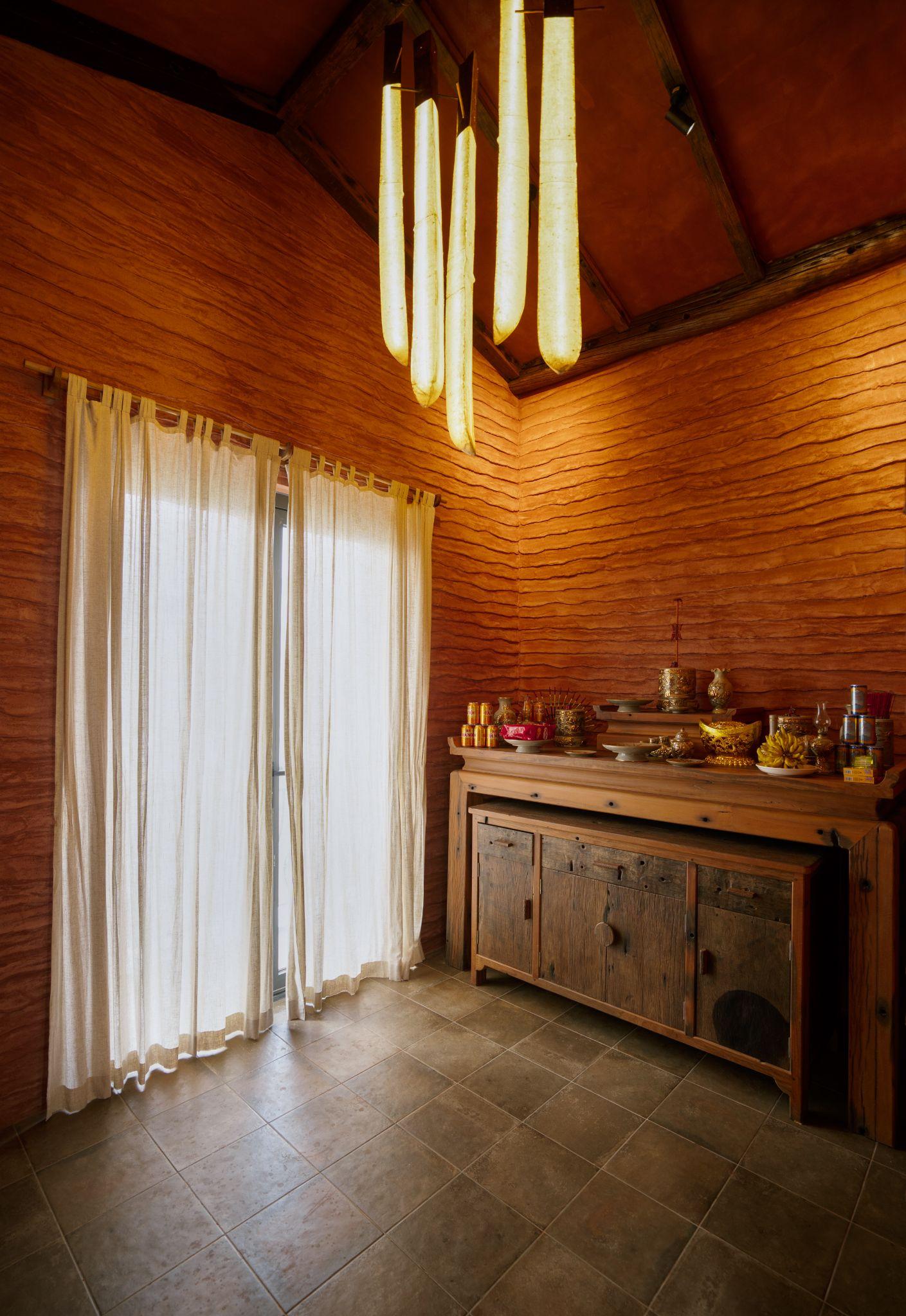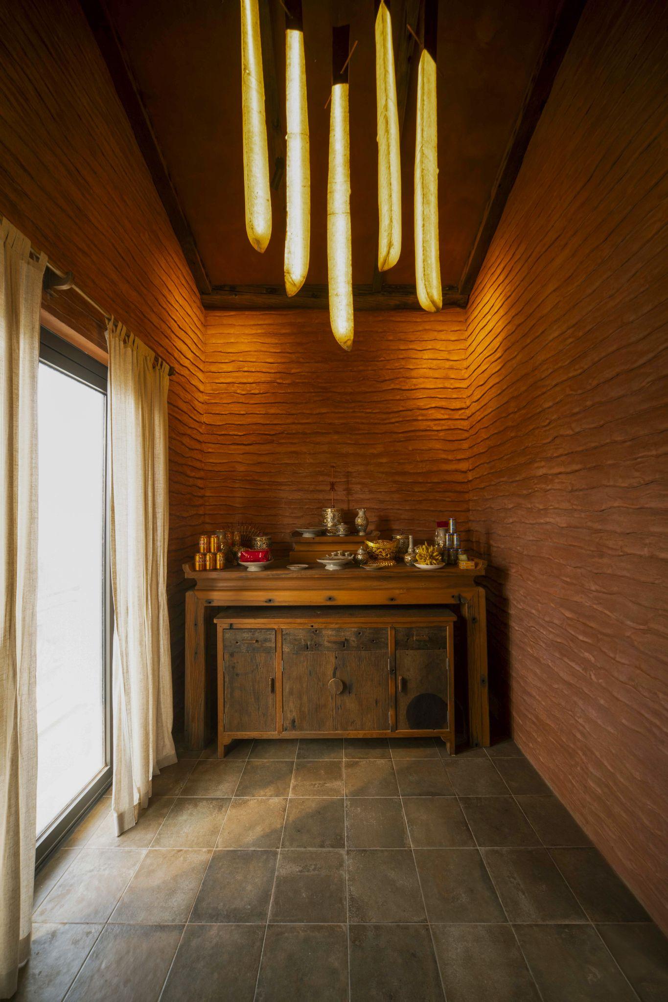Phòng thờ phủ sắc đất ấm, kết hợp ánh sáng tự nhiên và gỗ Táu cũ, gợi cảm giác trang nghiêm mà gần gũi
