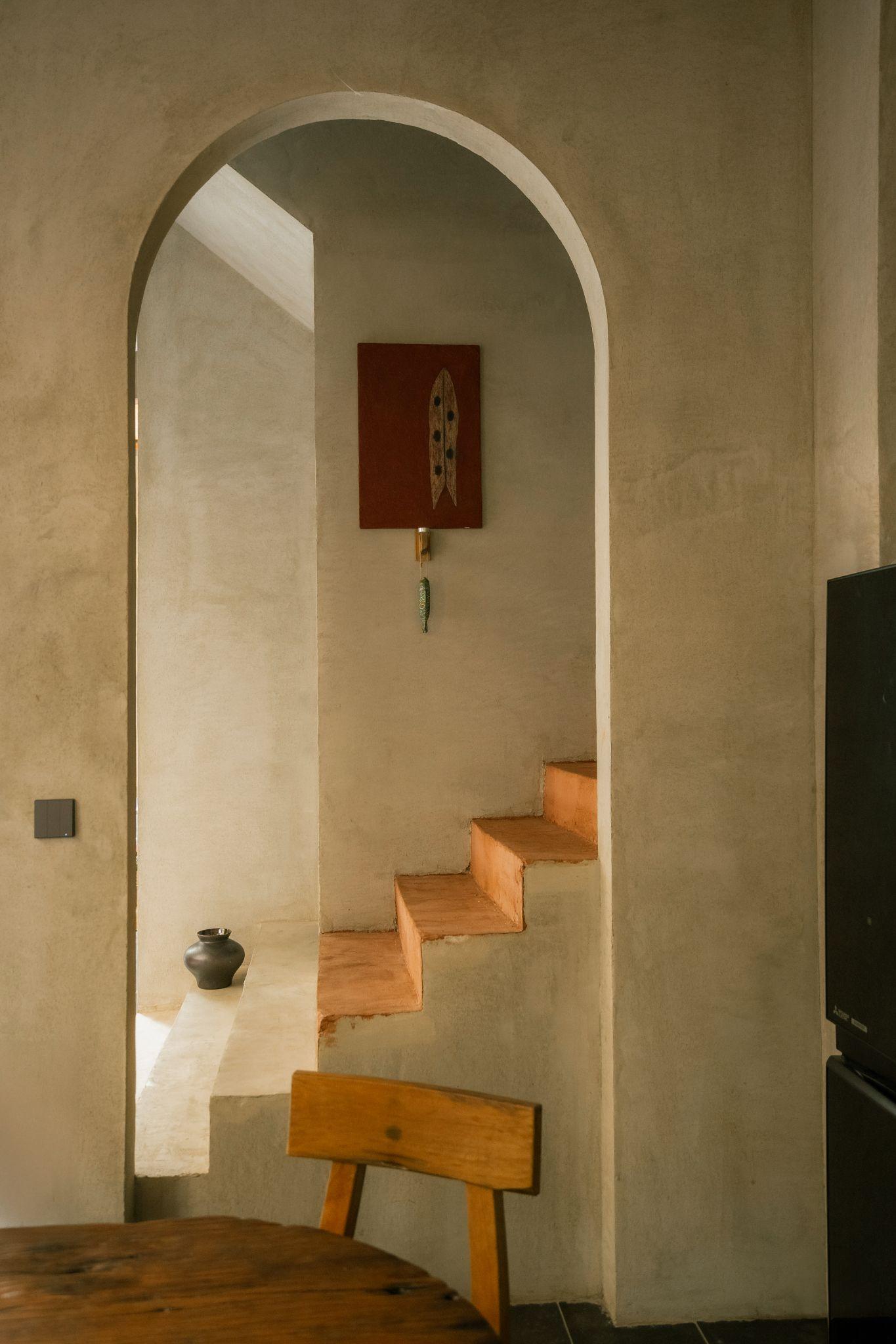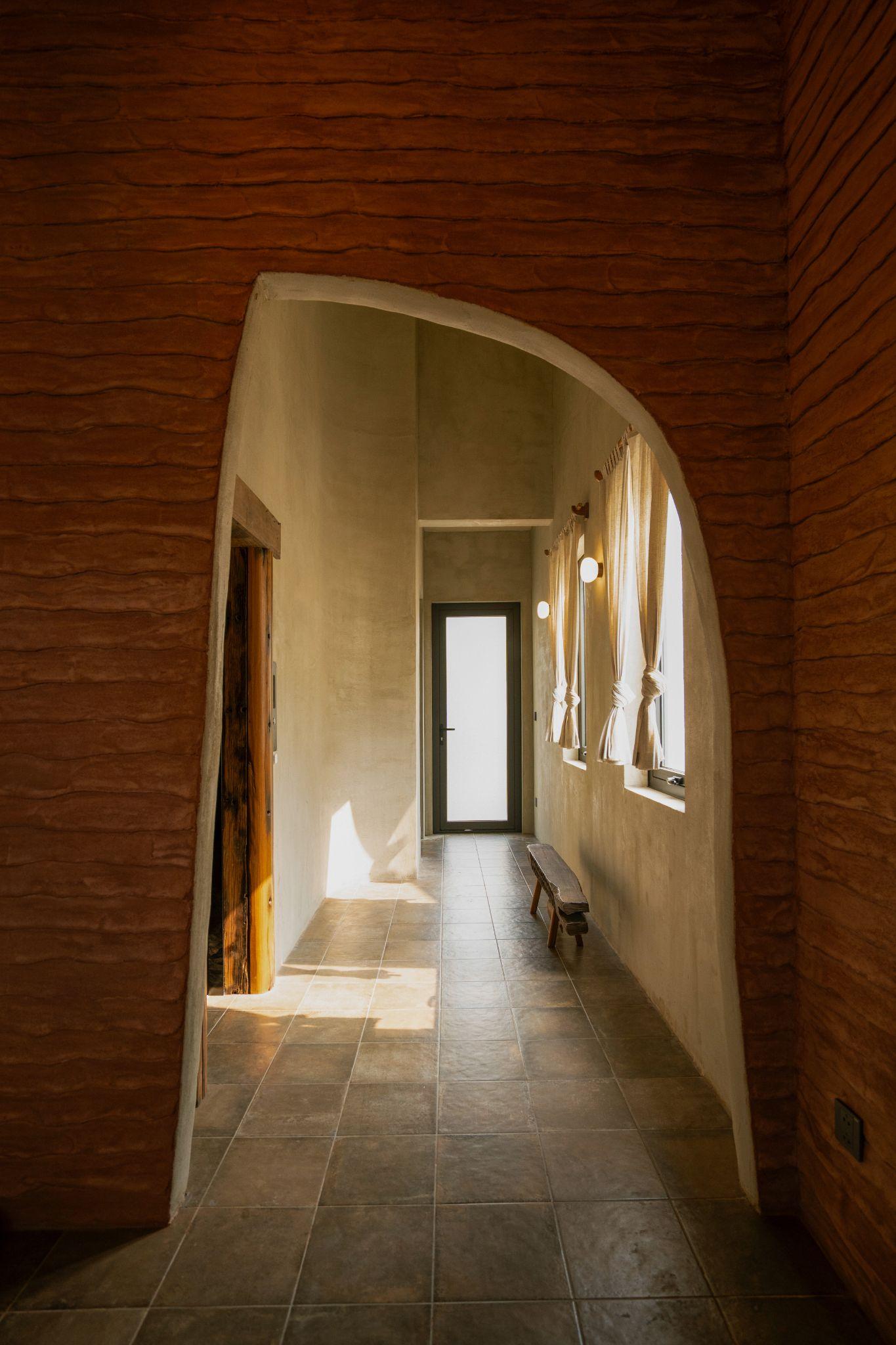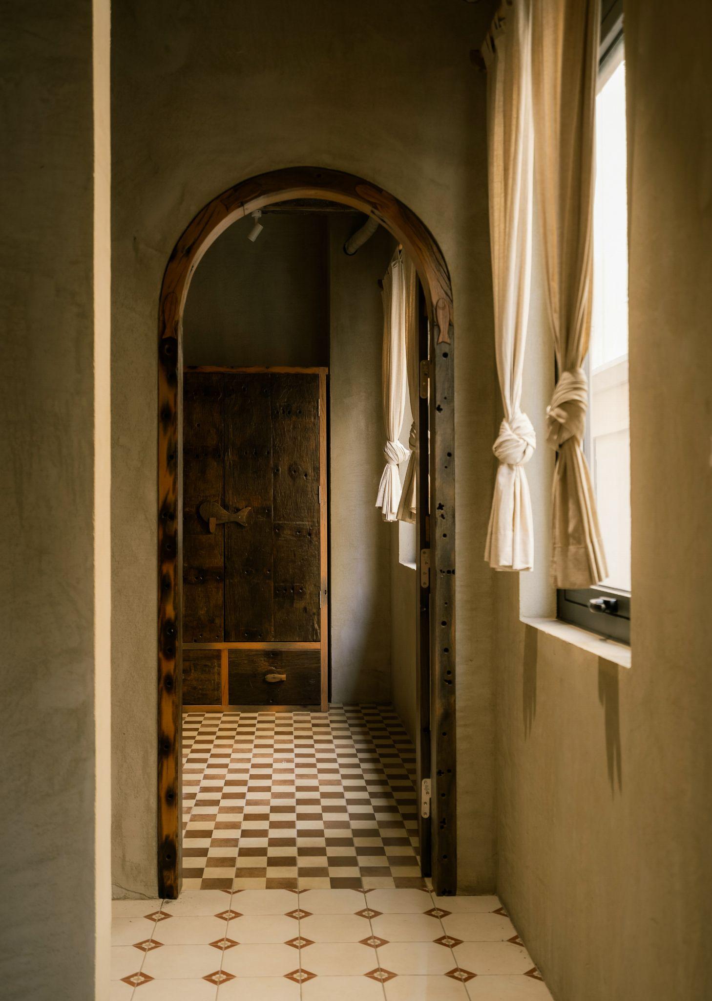 Lối vòm đất nung mở ra khoảng sáng tĩnh lặng, nơi từng bước chân khẽ vang lên giữa sắc ấm của tường và gió len qua rèm vải