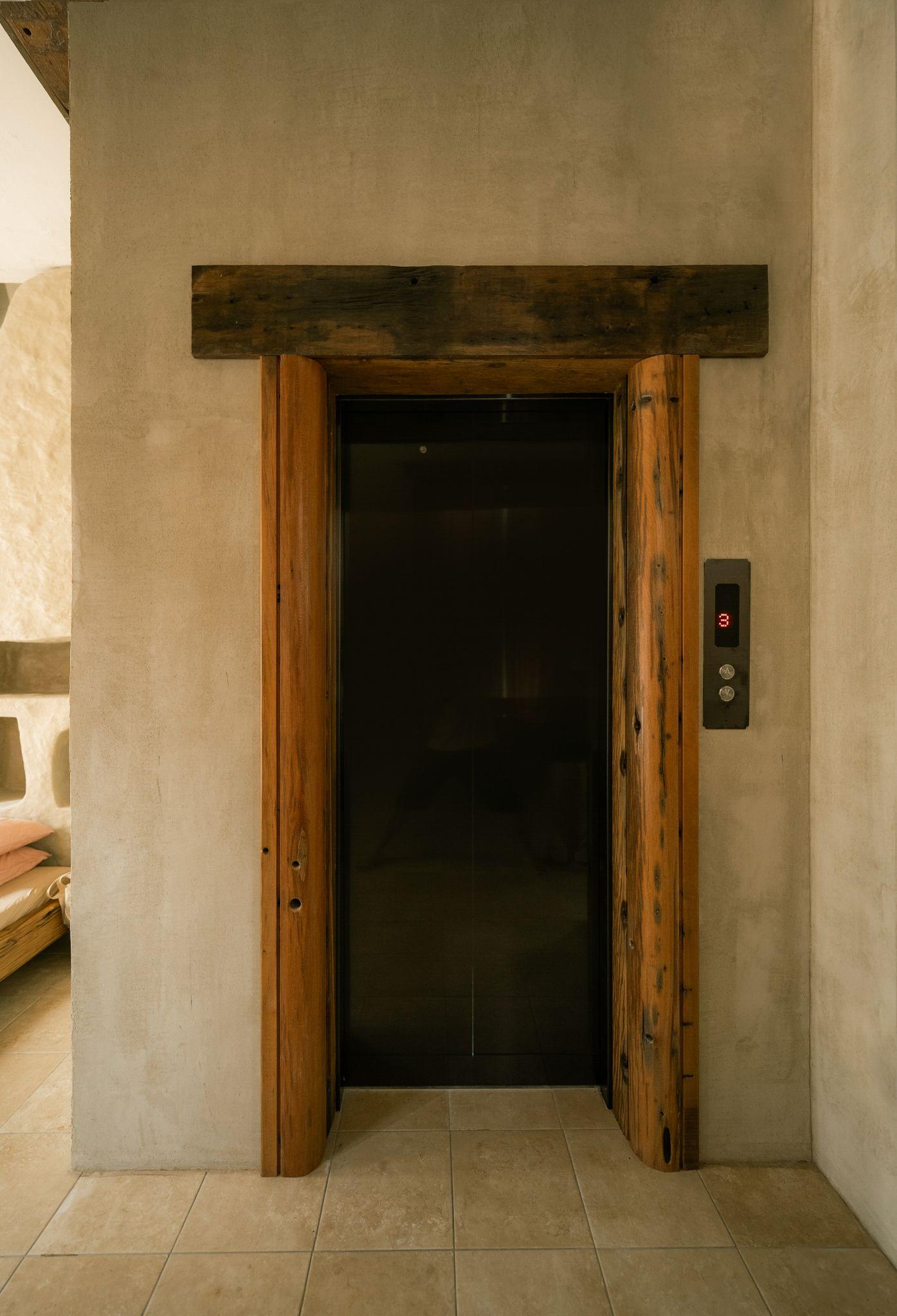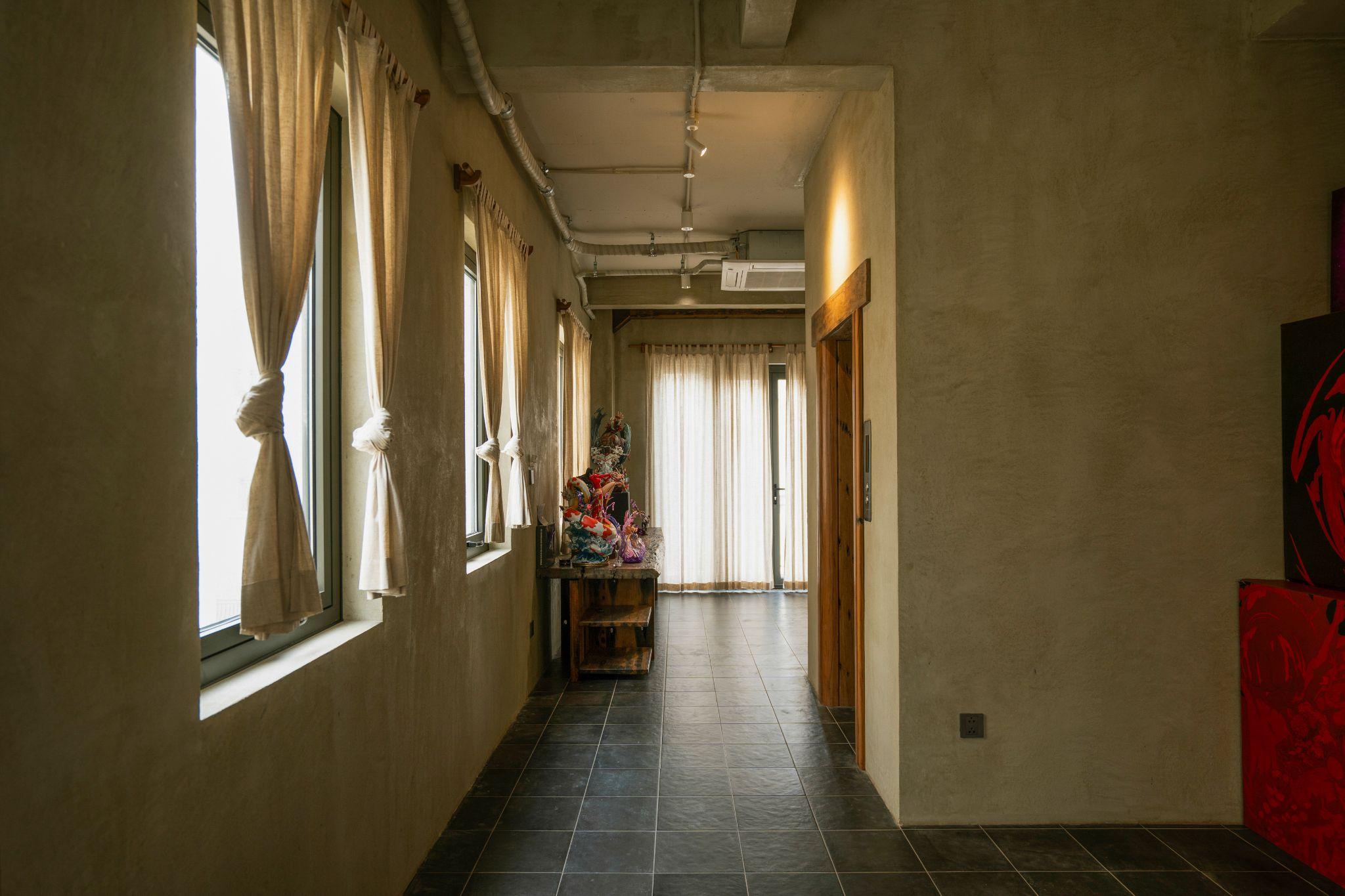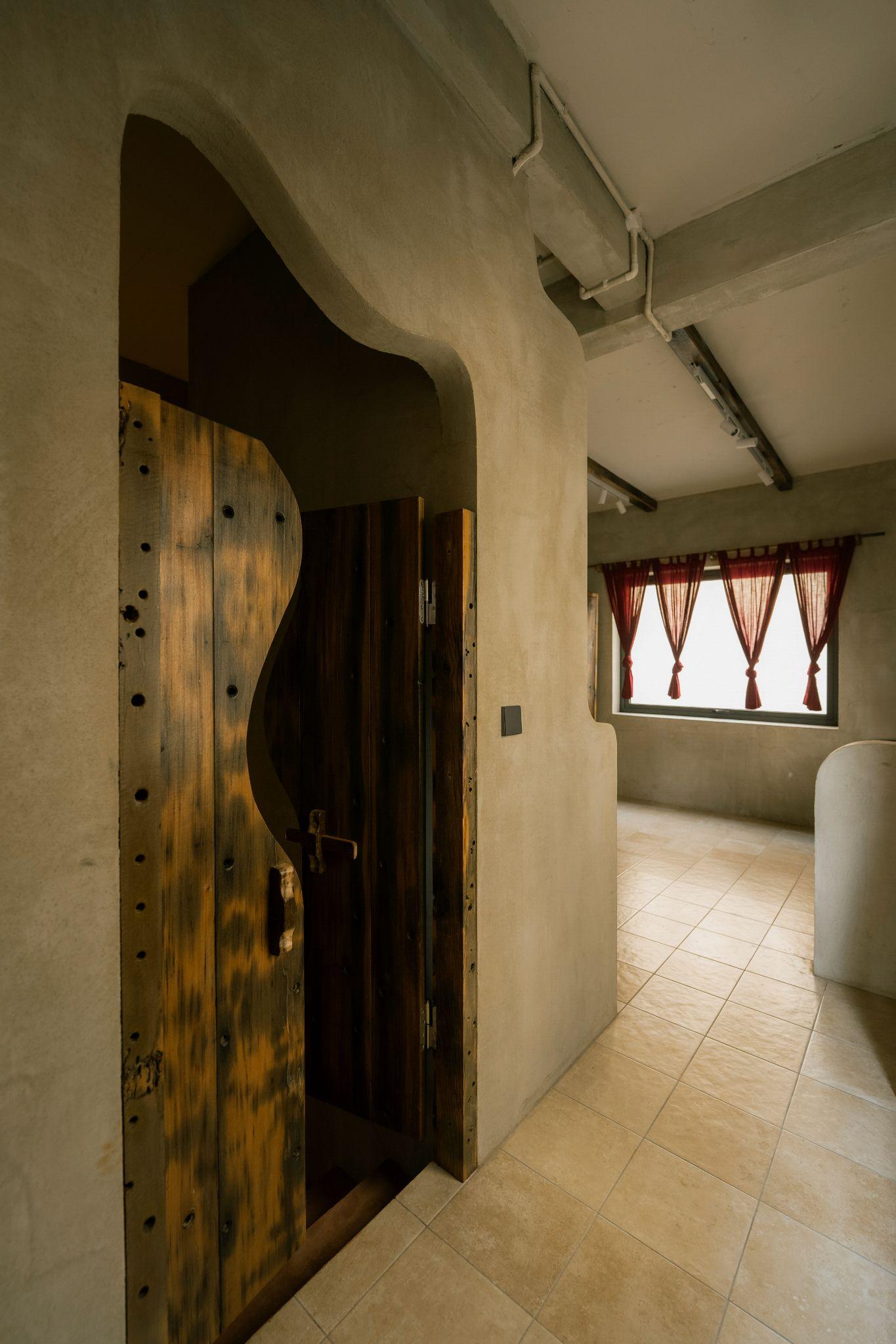 Lối vòm đất nung mở ra khoảng sáng tĩnh lặng, nơi từng bước chân khẽ vang lên giữa sắc ấm của tường và gió len qua rèm vải