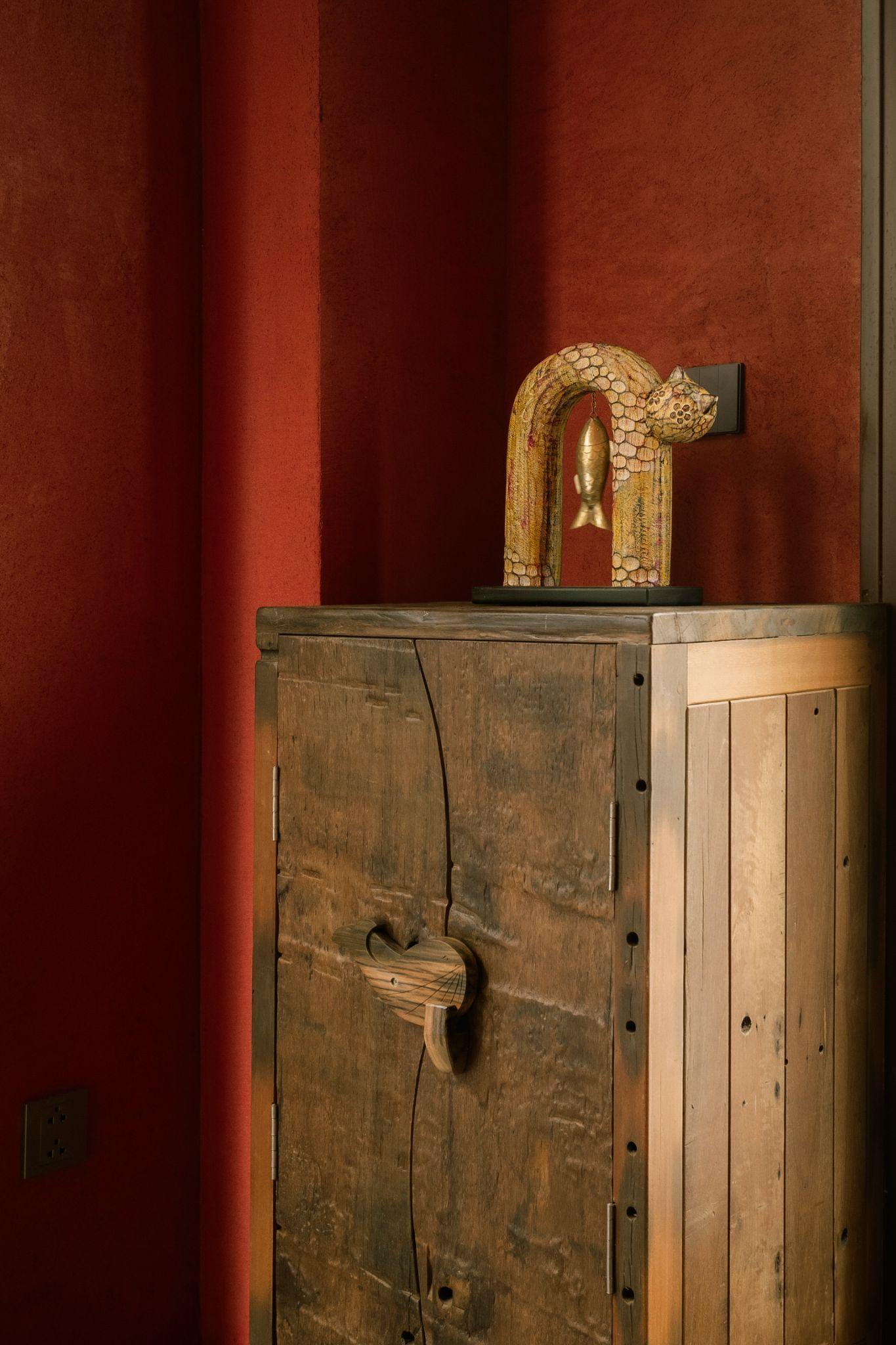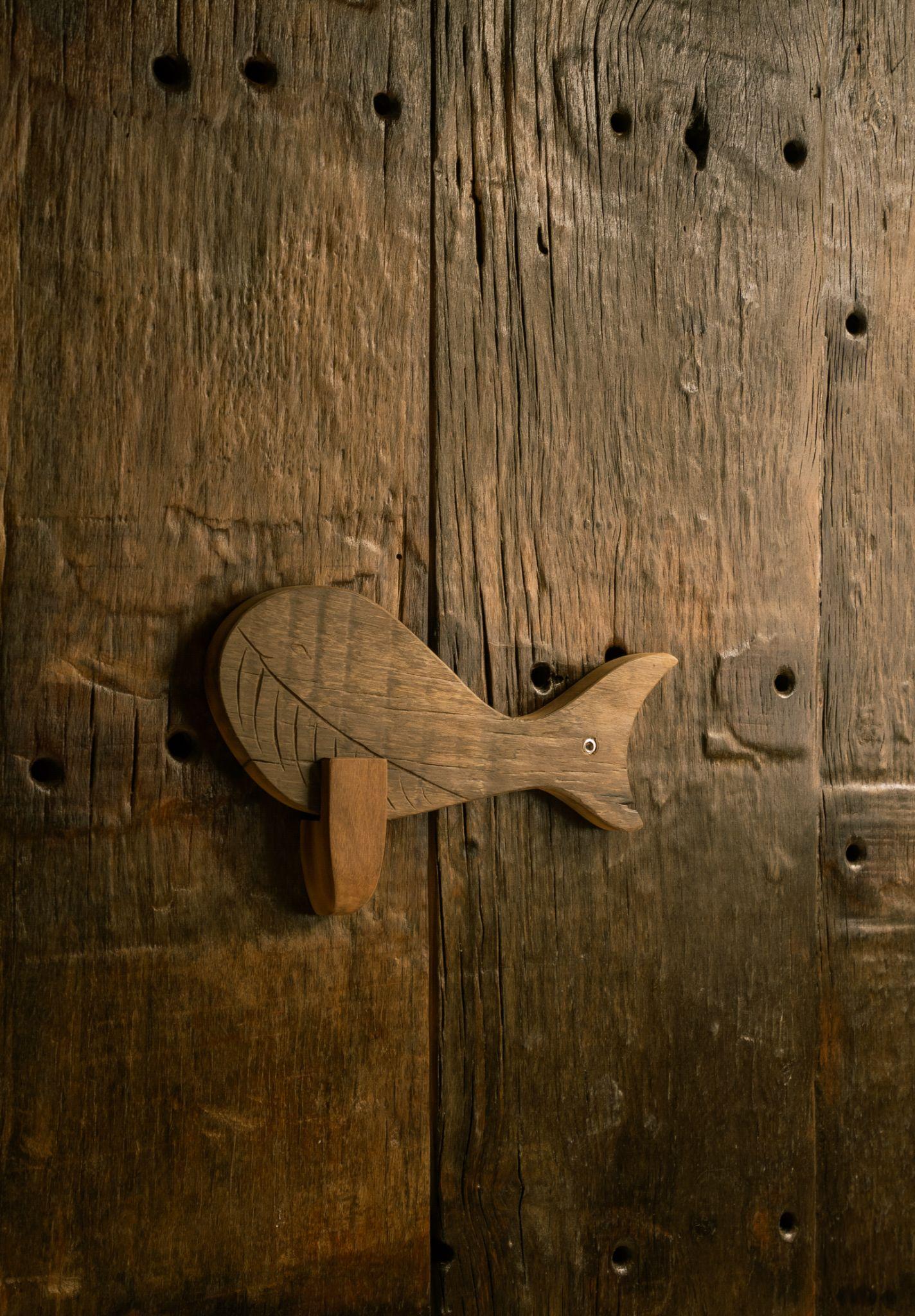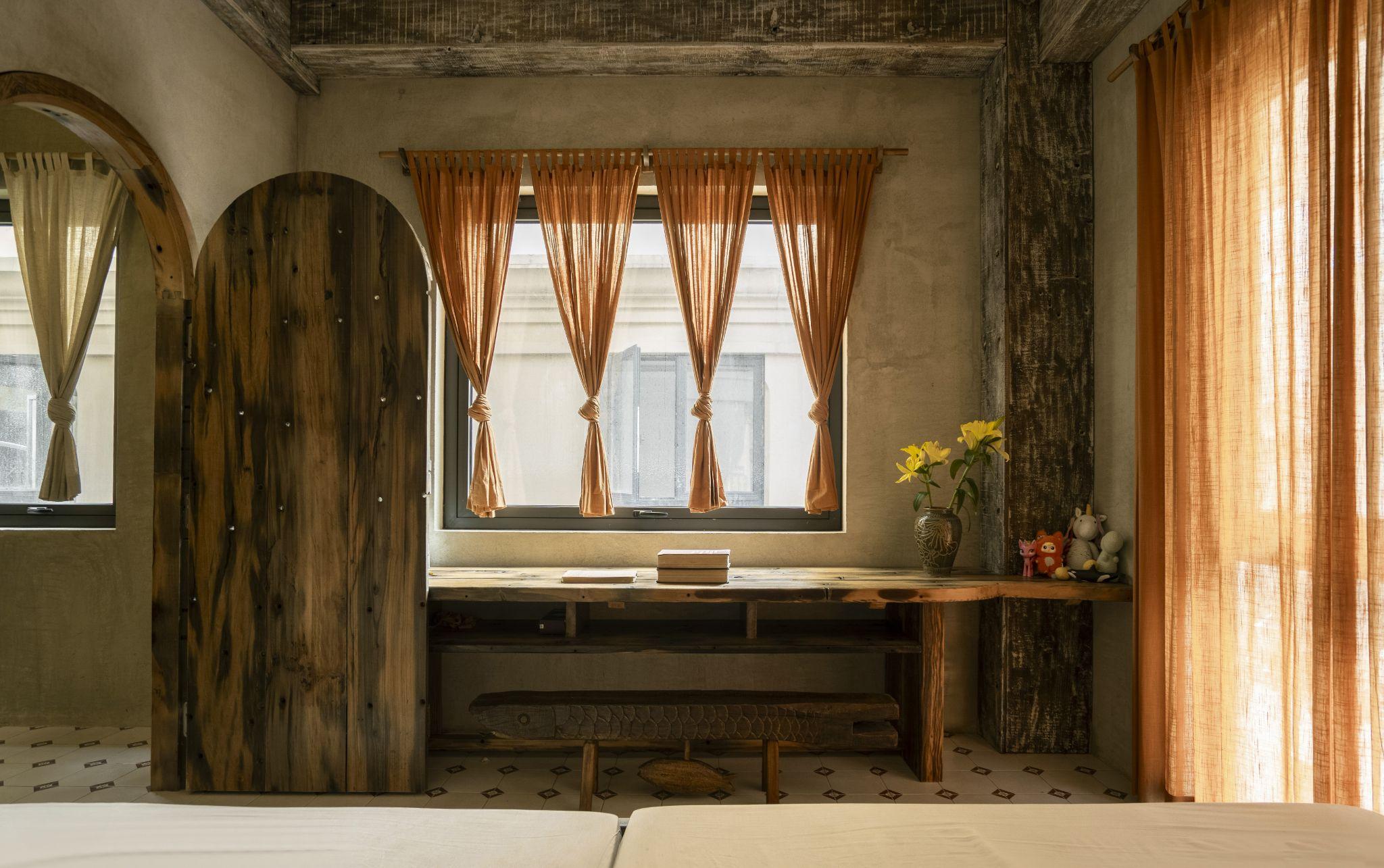 Nếu phần thô của “Hang Cá” thể hiện sự nguyên bản, thì nội thất lại kể tiếp chương chuyện về sự tái sinh. Toàn bộ đồ nội thất trong nhà được chế tác từ gỗ Táu – loại gỗ từng làm nên khung của những con tàu cũ, nay được “tái sinh” thành bàn ghế, tủ kệ, giường ngủ. Những thớ gỗ mang vết hằn của biển, mặn mòi và trầm tĩnh, trở thành lớp ký ức được gìn giữ giữa không gian mới.