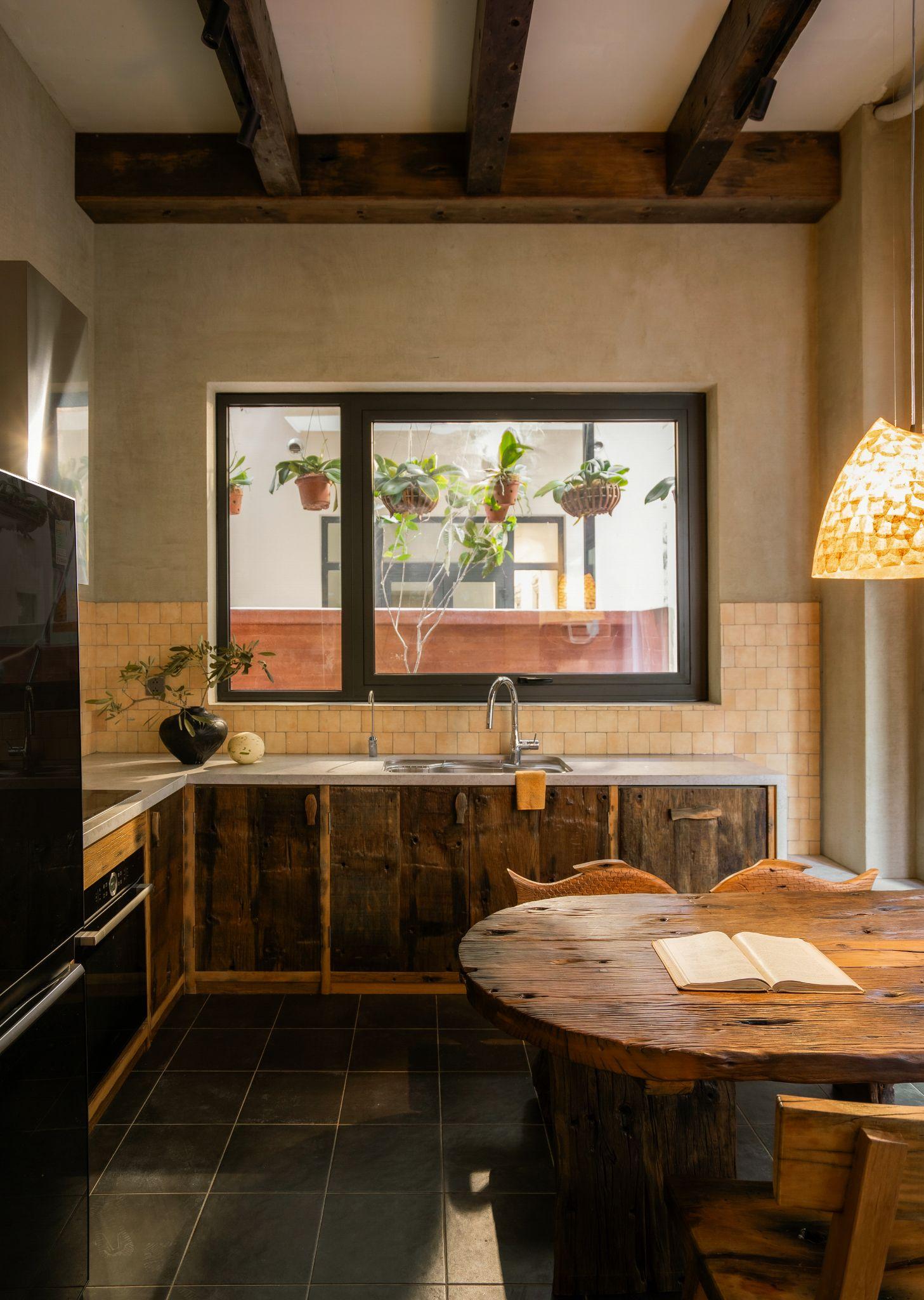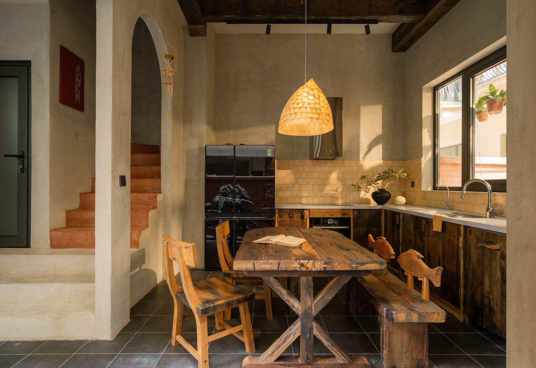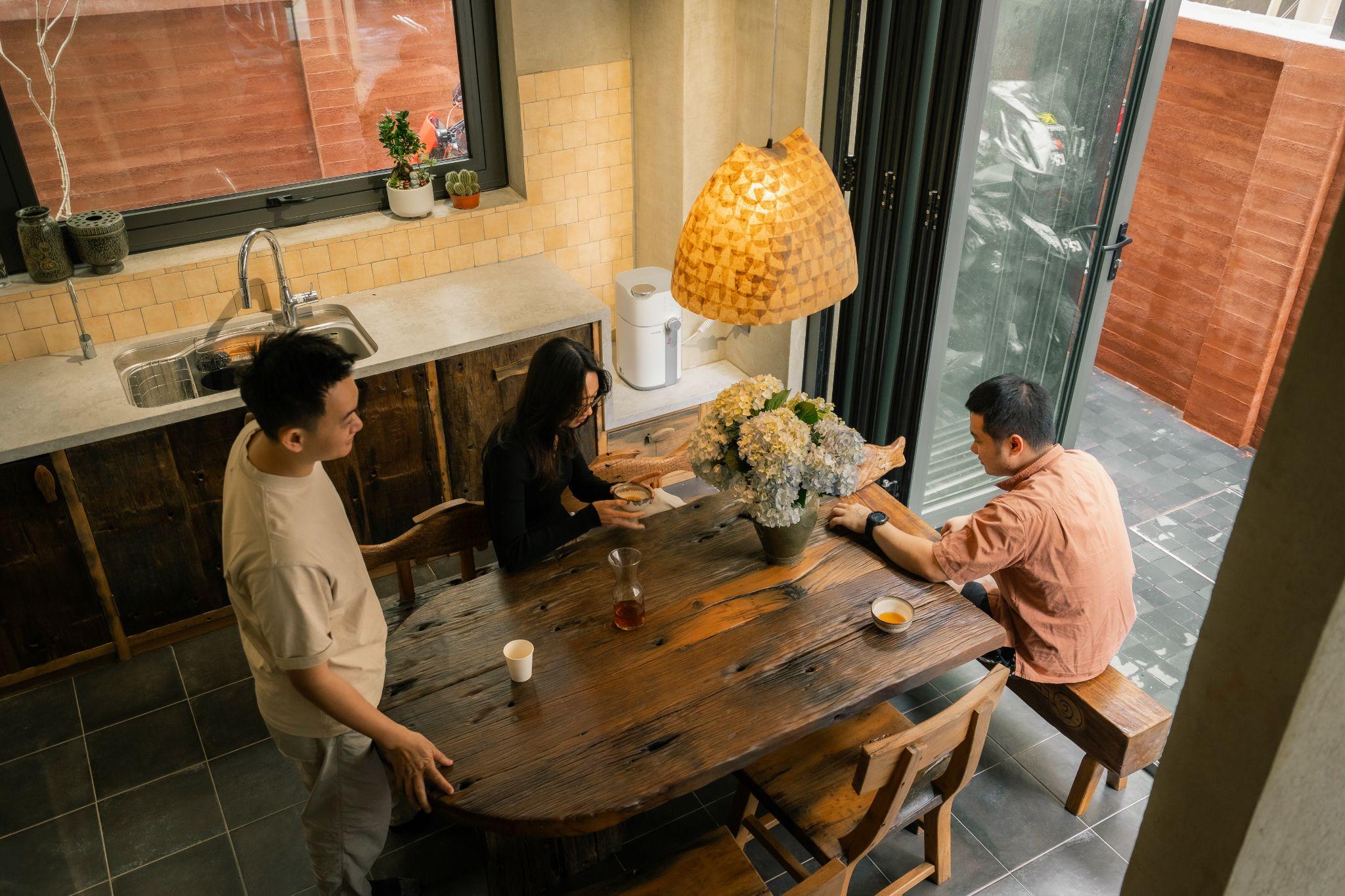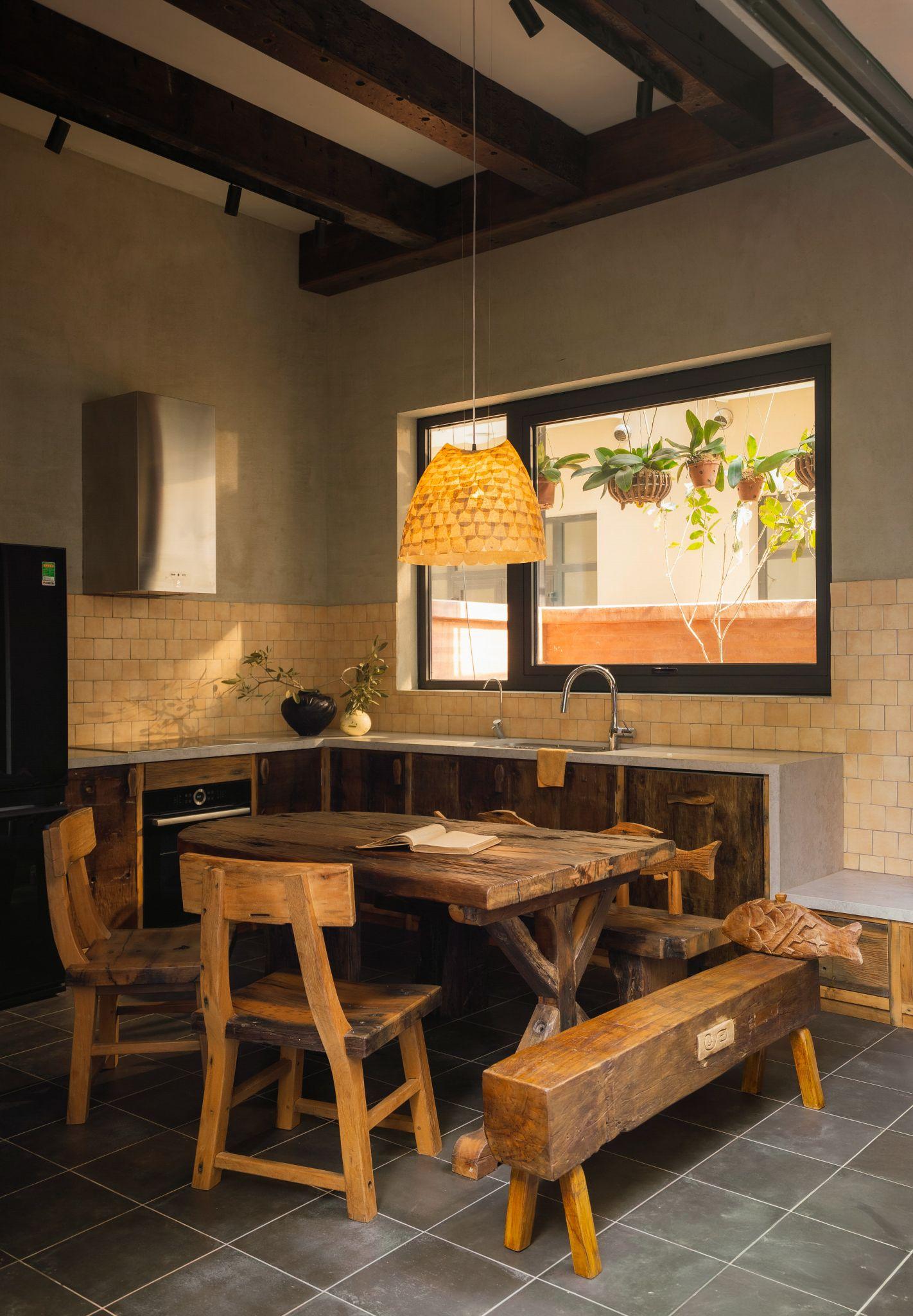Bàn ăn gỗ thô mộc cùng đèn thả trần như kể câu chuyện nhẹ nhàng về quá khứ - hiện tại