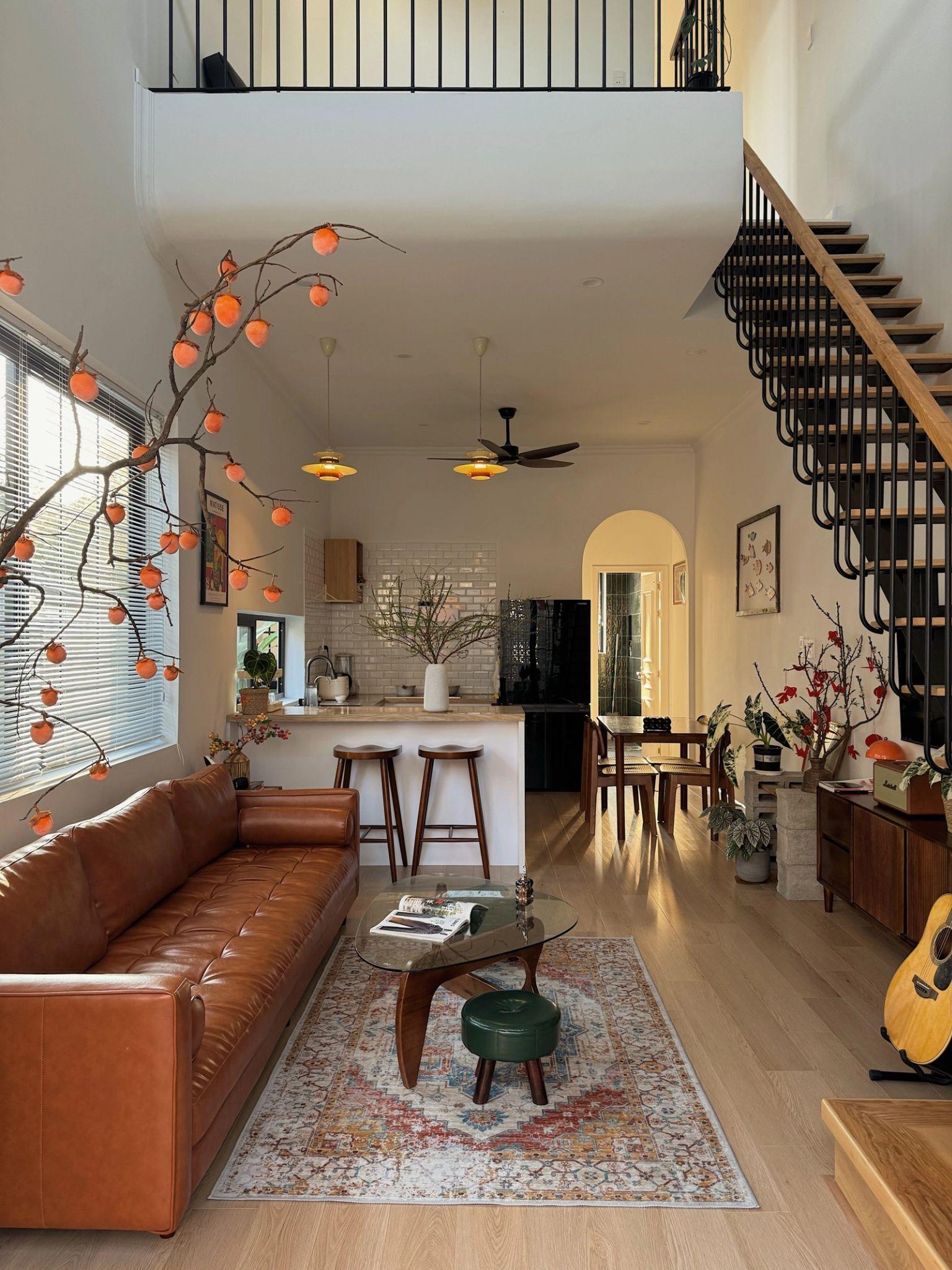 Cấu trúc thanh thoát của cầu thang cho phép ánh sáng và tầm nhìn xuyên qua một cách dễ dàng, duy trì sự kết nối thị giác và giúp không gian luôn thông thoáng. Sự tương phản giữa màu gỗ ấm và màu đen mạnh mẽ của kim loại tạo nên một chi tiết trang trí mang tính điêu khắc, bổ sung hoàn hảo cho phong cách Mid-century Modern.