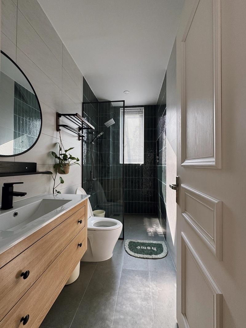 Phòng tắm nhỏ gọn nhưng giàu thẩm mỹ, kết hợp gạch thẻ xanh rêu, tủ gỗ sồi ấm áp và ô cửa sổ lấy sáng thông minh.
