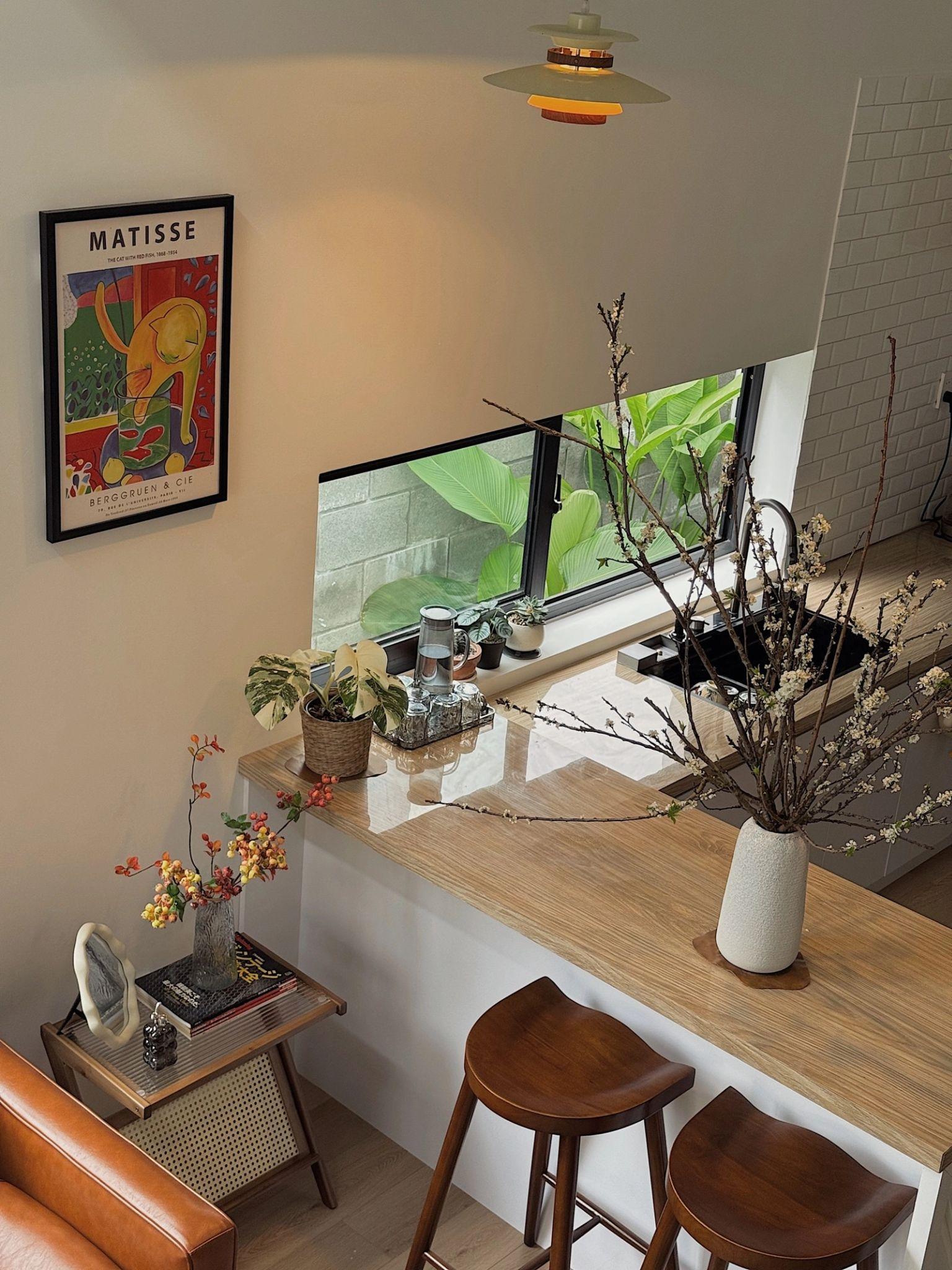 Quầy bar bếp tối giản trở thành một gallery nhỏ, nơi nghệ thuật và thiên nhiên giao thoa trong ánh sáng dịu dàng
