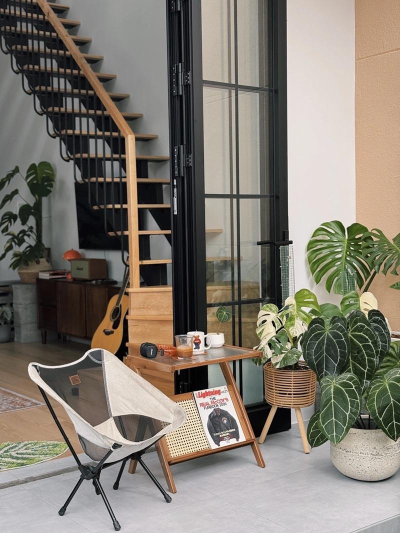 Cầu thang không chỉ thực hiện chức năng giao thông mà còn được coi là một yếu tố thẩm mỹ quan trọng, góp phần định hình phong cách và sự thoáng đãng cho ngôi nhà. Để tránh sự bí bách, gia chủ đã lựa chọn hệ cầu thang xương cá với kết cấu gọn nhẹ, gồm các bậc thang bằng gỗ tự nhiên và lan can bằng sắt hộp sơn đen. Thiết kế không có cổ bậc (open-riser) và được đặt sát tường để tối ưu hóa diện tích sàn.