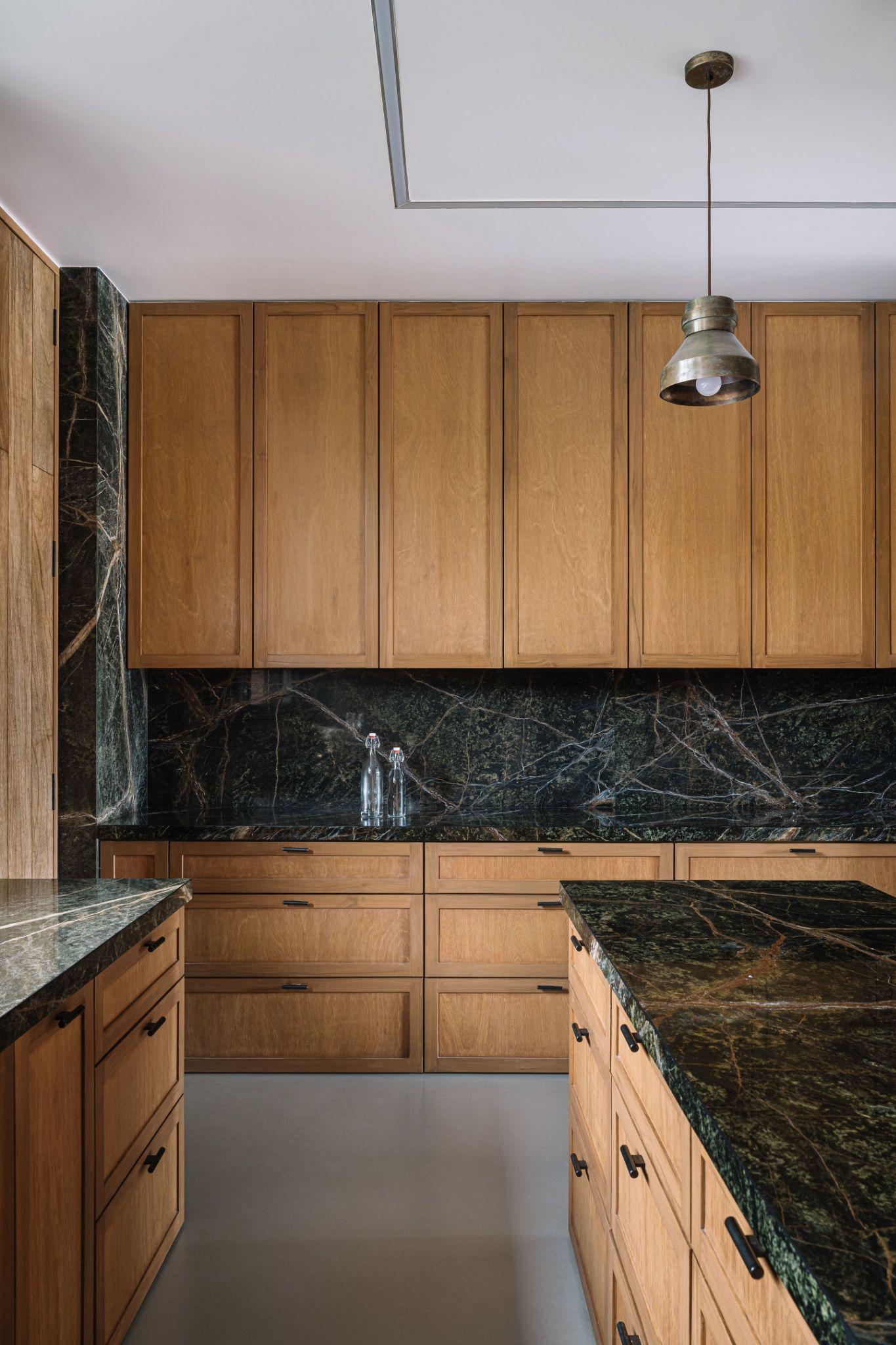 Không gian bếp nổi bật với tủ gỗ tếch và mặt bàn đá granite xanh đậm. Sự kết hợp của vật liệu tự nhiên mang lại vẻ sang trọng nhưng gần gũi