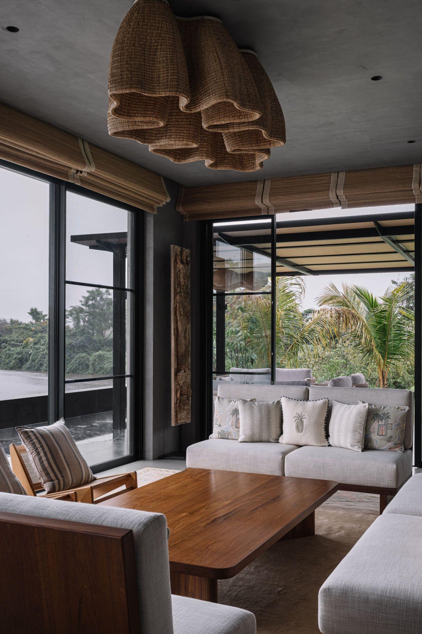 Không gian phòng khách ngập ánh sáng tự nhiên, nơi chất liệu vải lanh, gỗ và mây hòa cùng gam màu trung tính. Đèn trần đan thủ công tạo điểm nhấn mềm mại giữa trần xi măng mịn